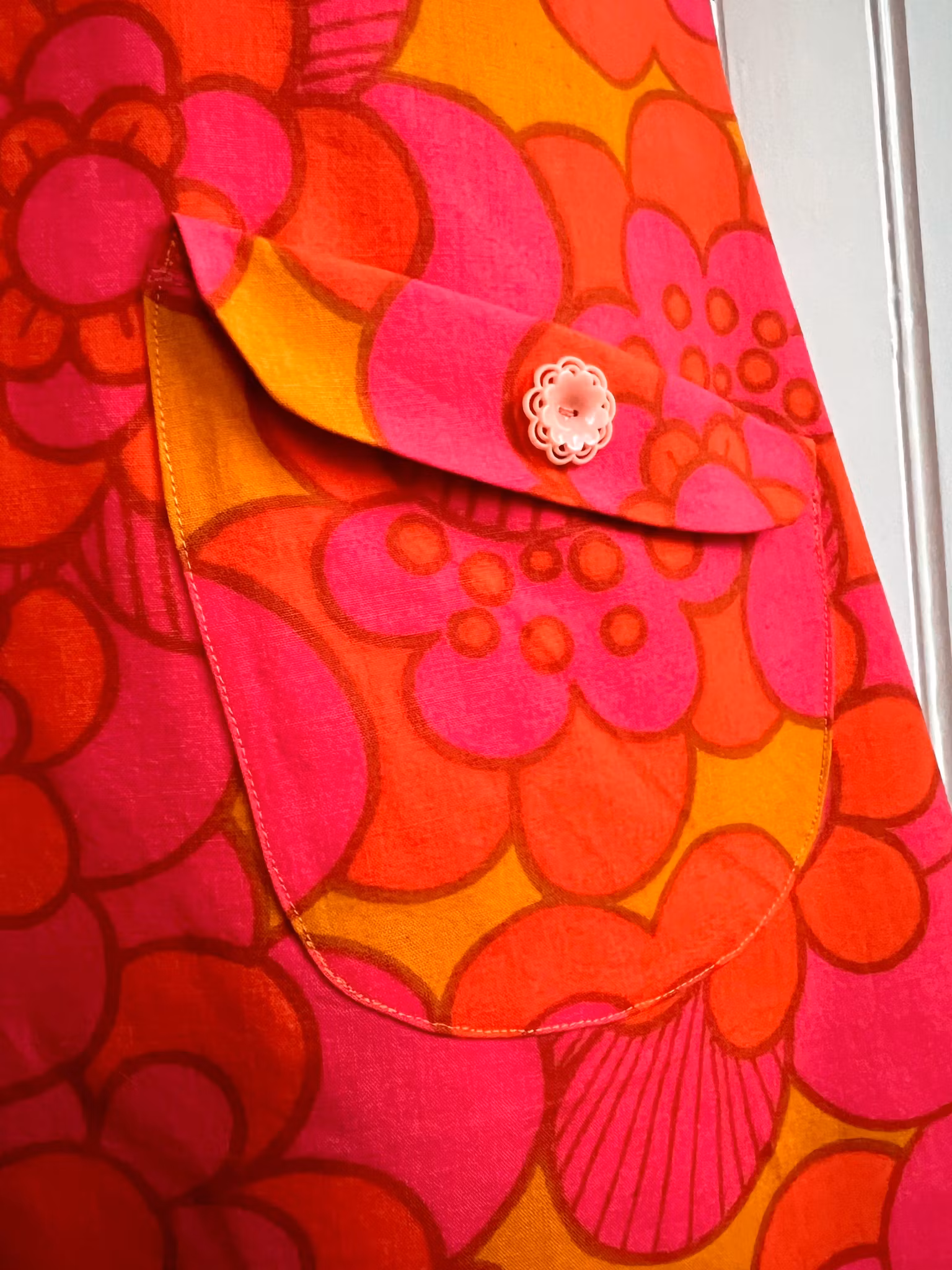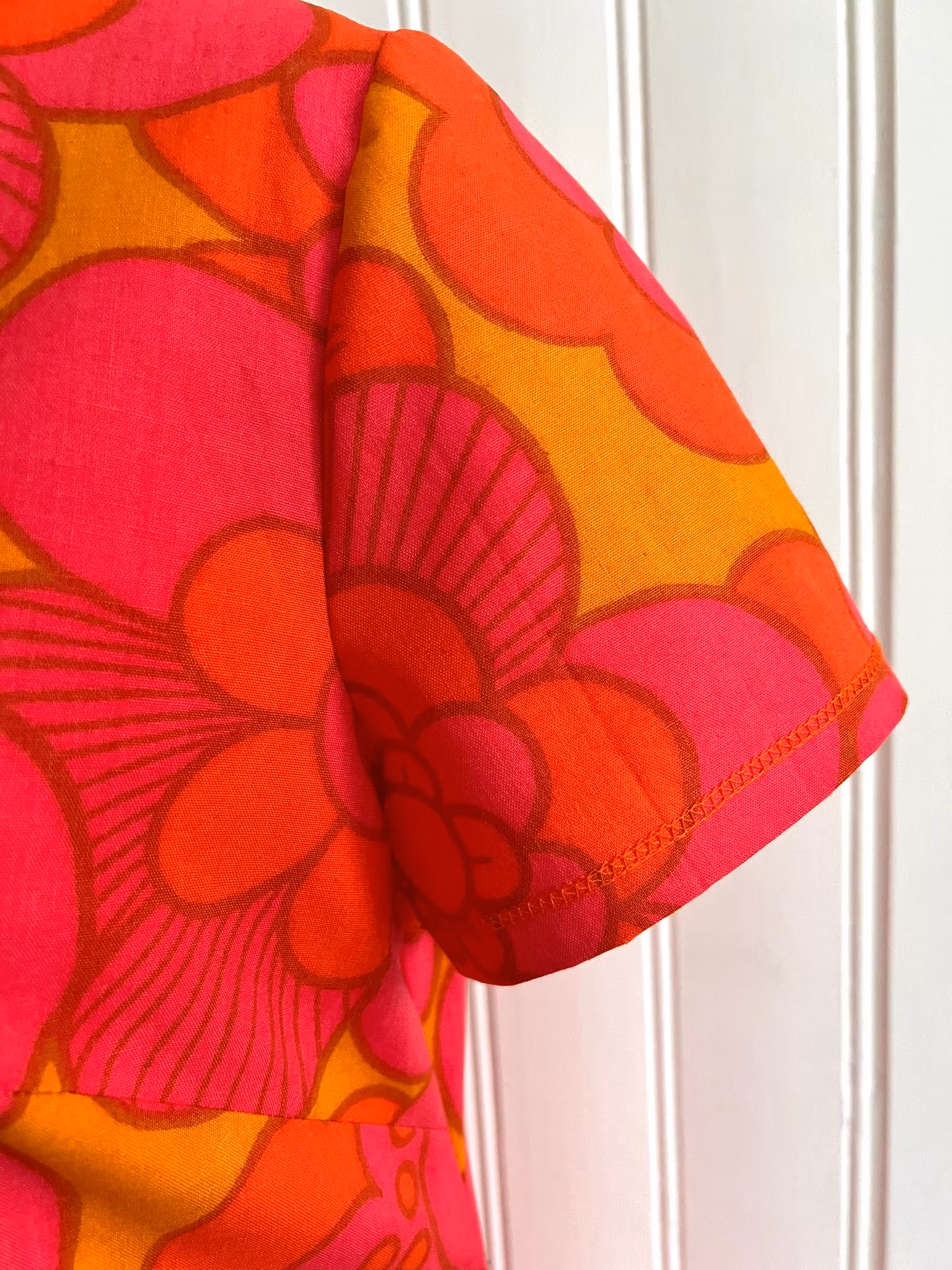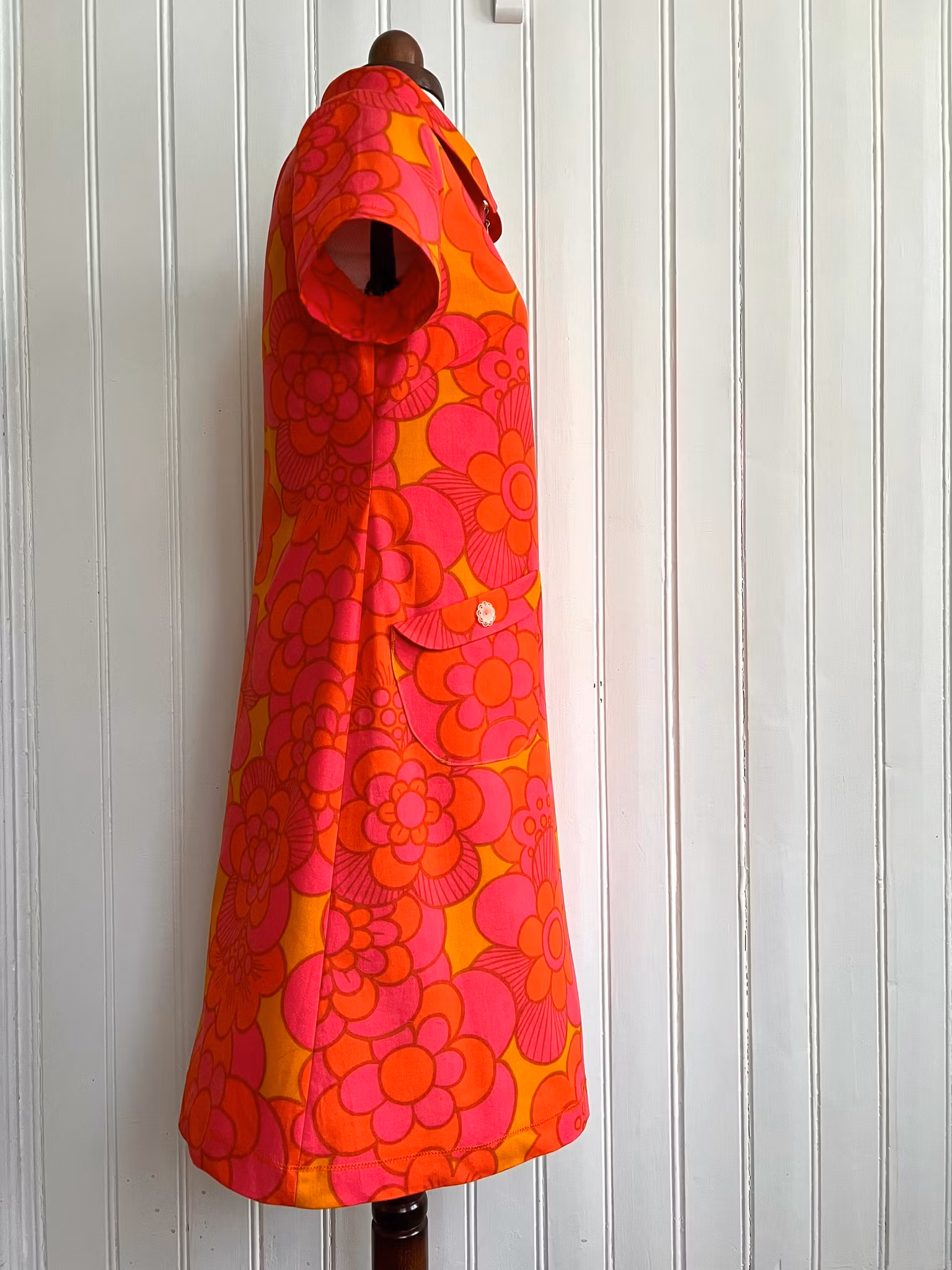 Klänning sydd i A-linjemodell i ett äkta retrotyg i vävd bomull från 1960- eller 70-talet.