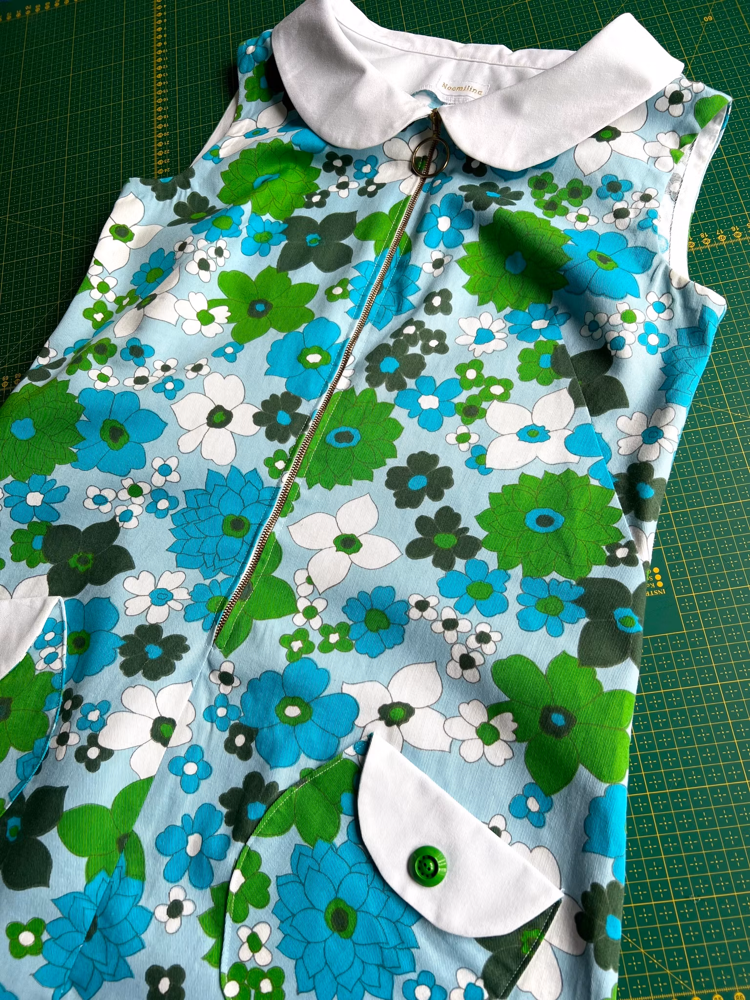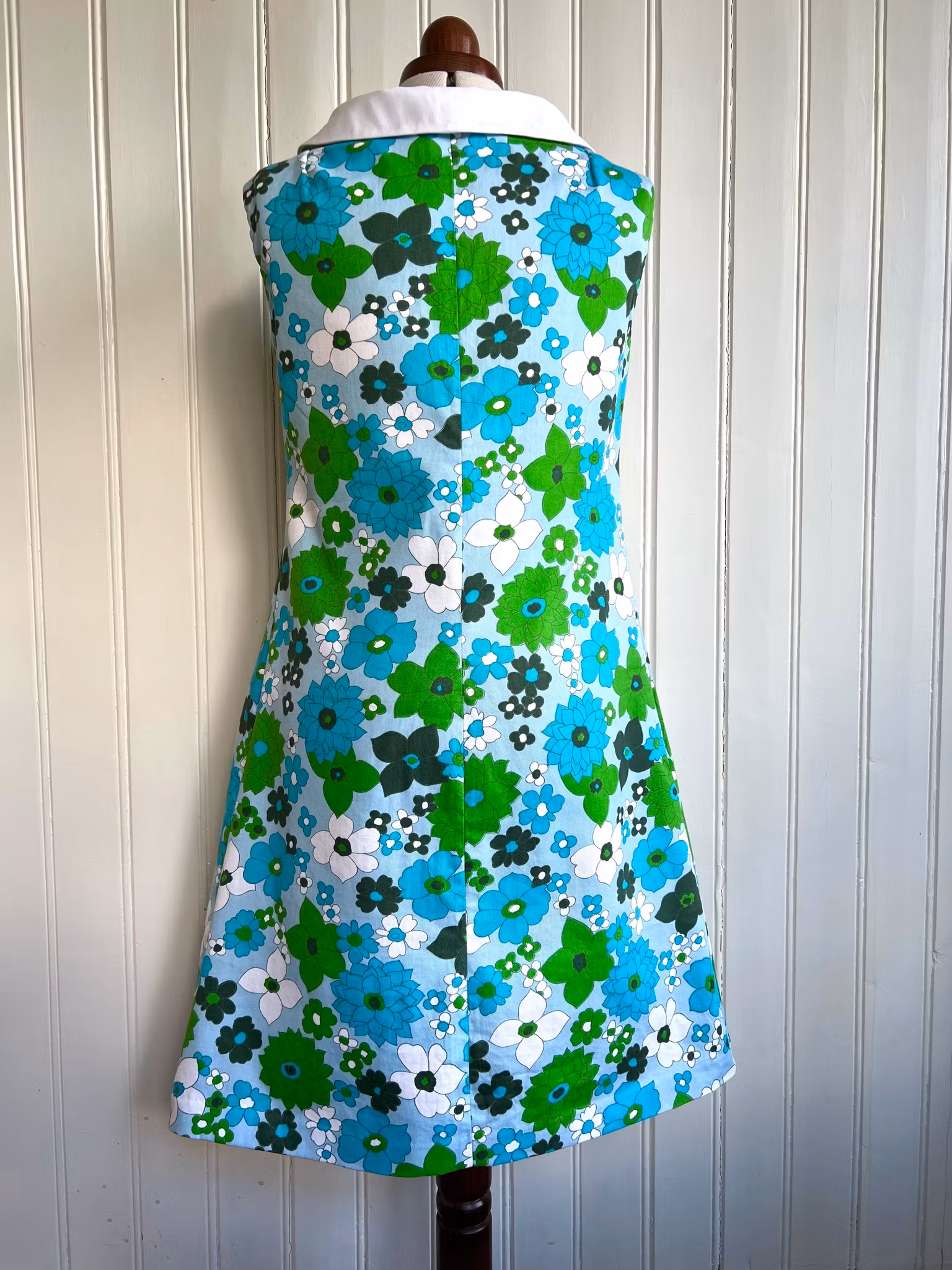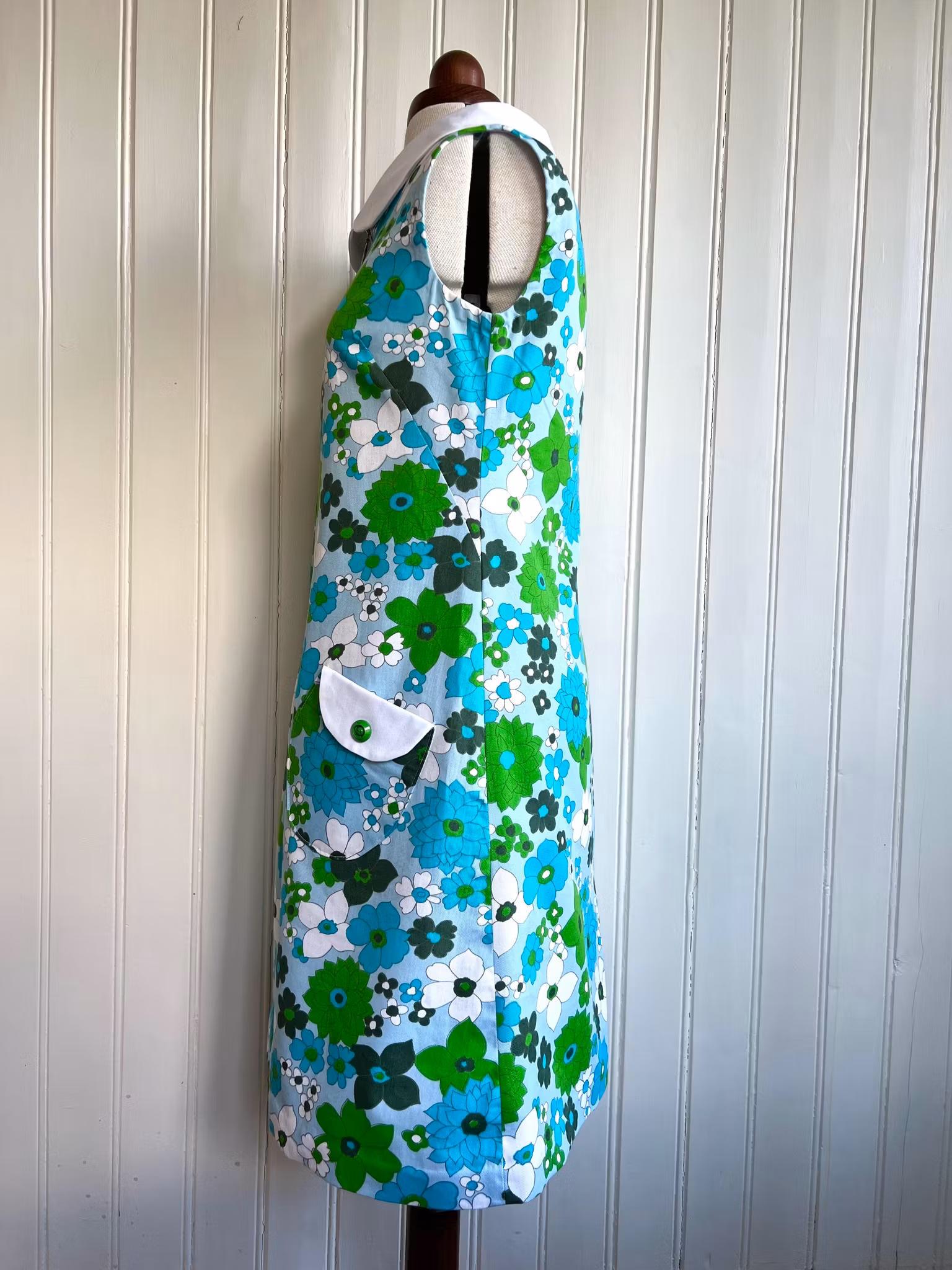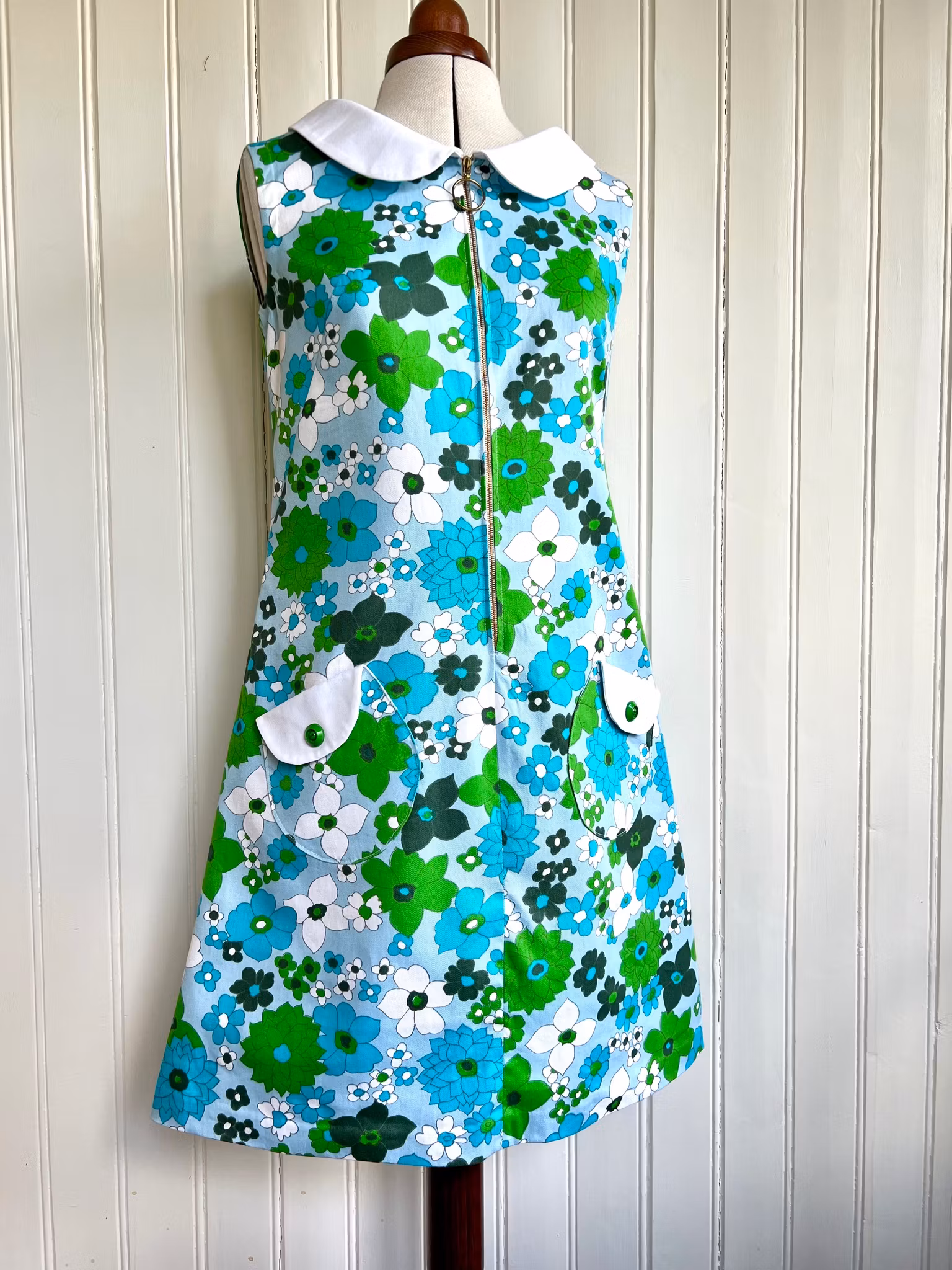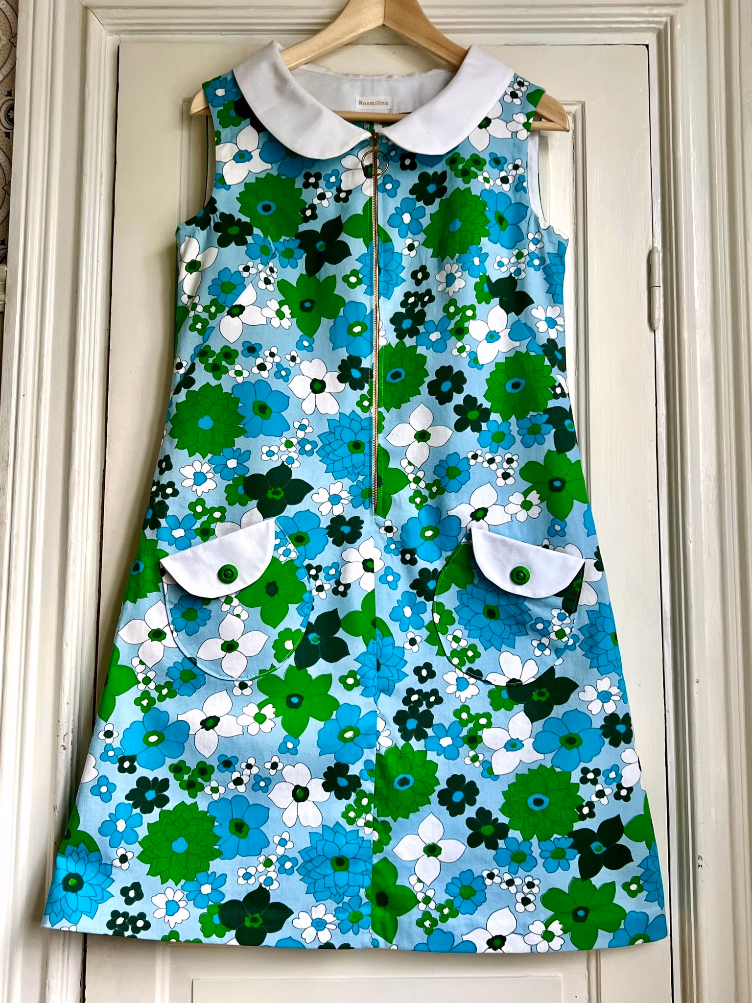 Klänning i riktigt tidstypisk 1960-talsmodell, A-linjeform,i ett äkta retrotyg i bomull från samma tid. Klänningen har en rundad krage och dragkedja i metall med ring framtill. Den har också fina rundade fickor med lock och knapp. Klänningen har dold handsydd fåll i Ärmhål och nertill.
