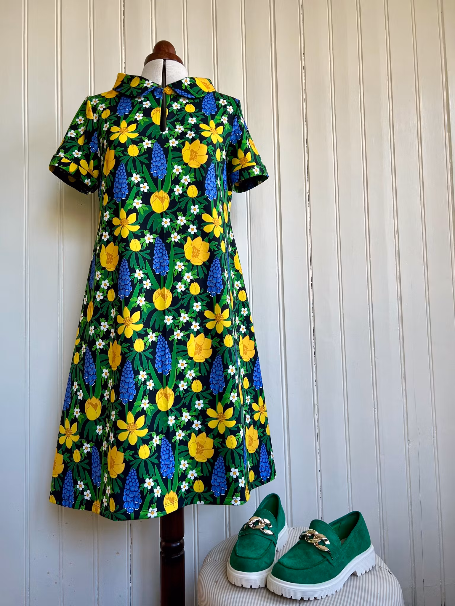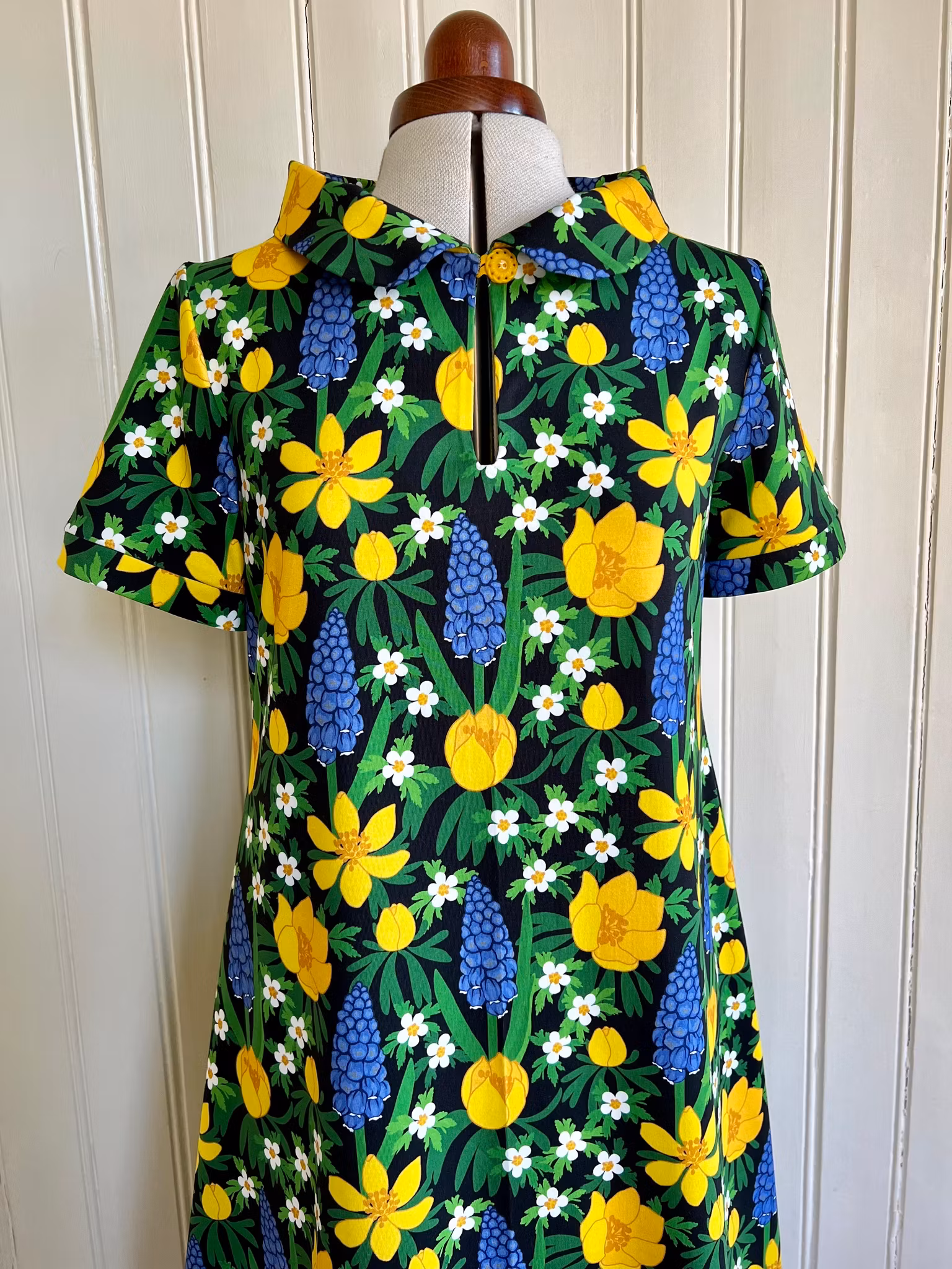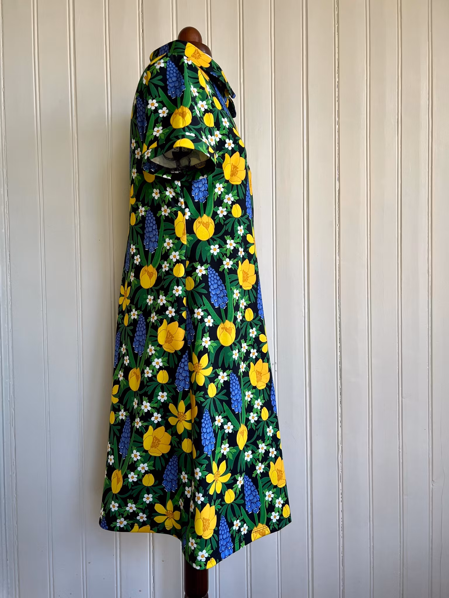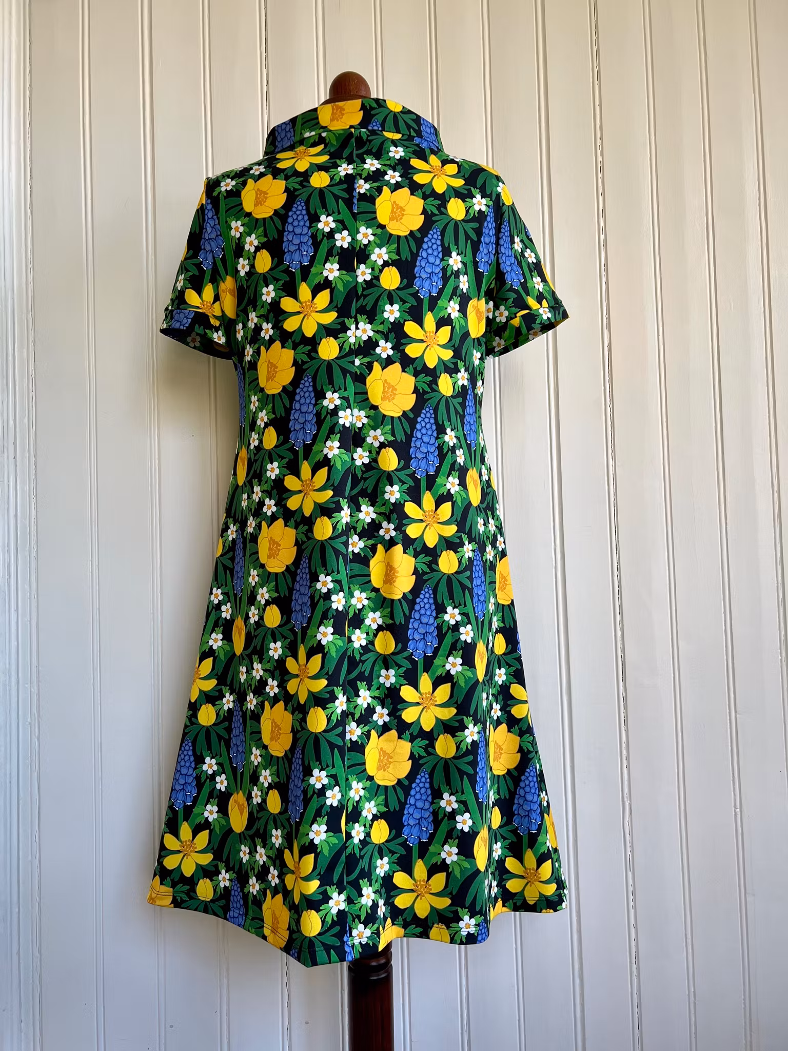 Klänning i A-linjemodell sydd i mjuk och härlig bomullsjersey. Klänningen har en rundad krage och en knapp framtill som håller ihop ringningen och utgör en fin detalj. Den har kort ärm.