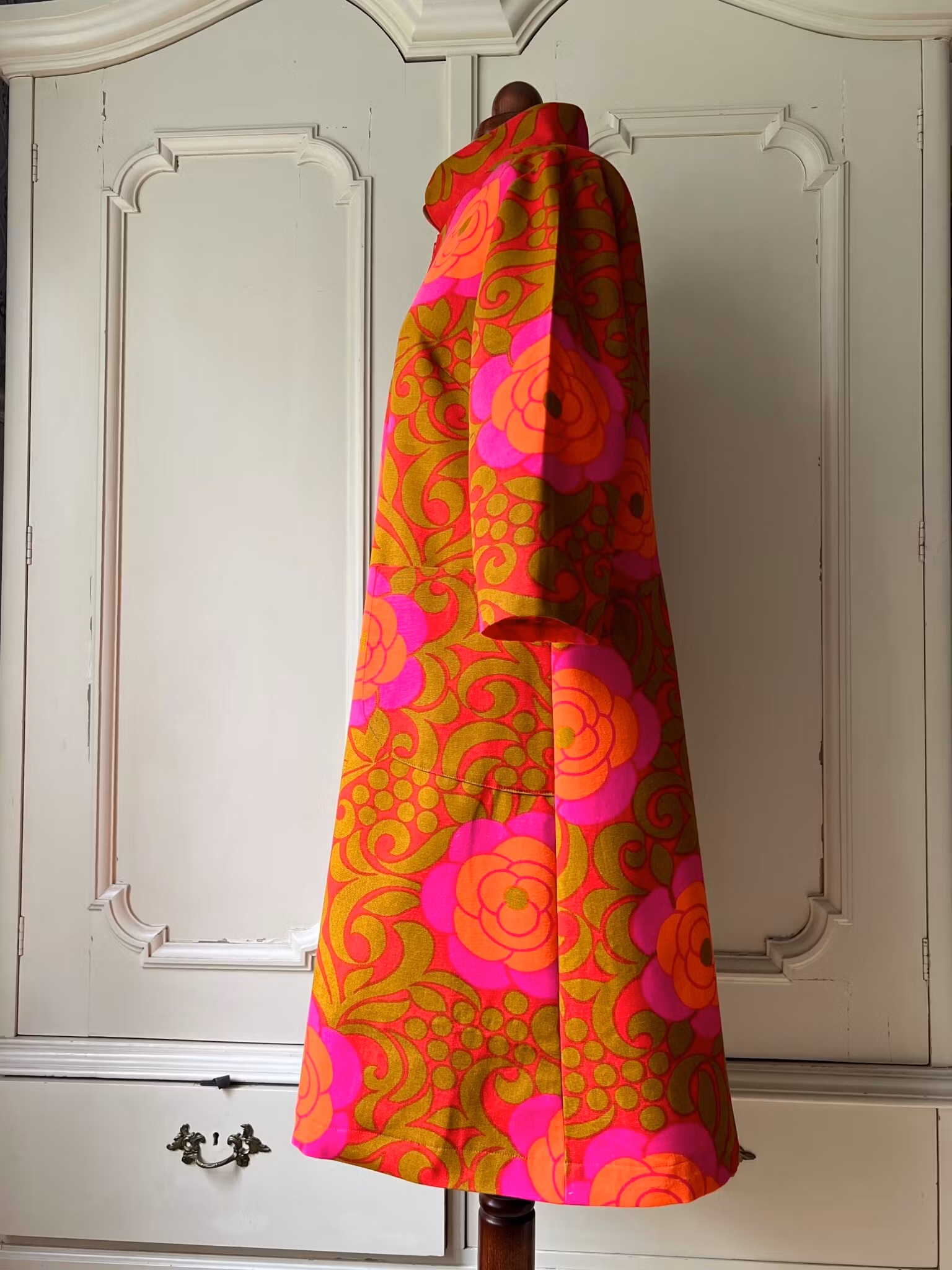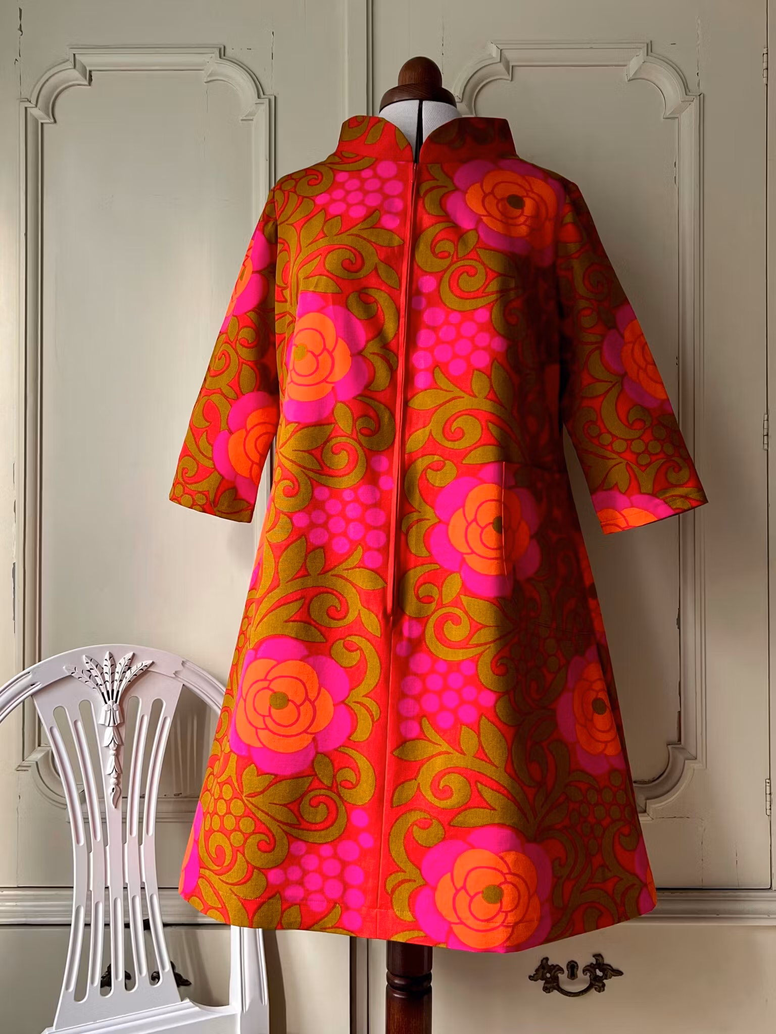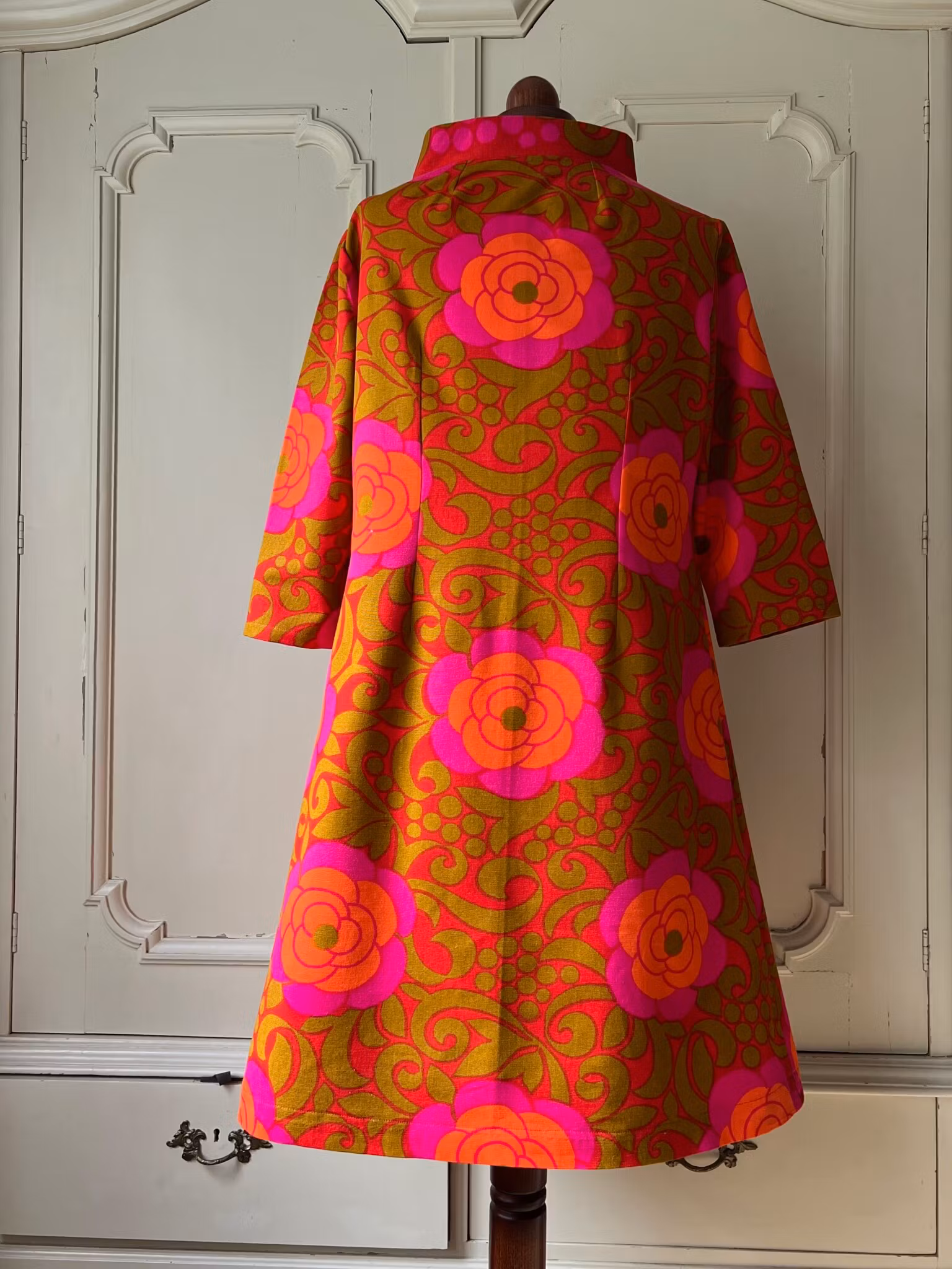 Klänning i A-linjemodell sydd i ett äkta retro/vintagetyg i vävd bomull. Den har en rundad ståkrage och lång dragkedja fram. Små insnitt i ryggen. Ärmen är 3/4 lång. I ena sidan finns en ficka som smälter fint in i tygets mönstrer.