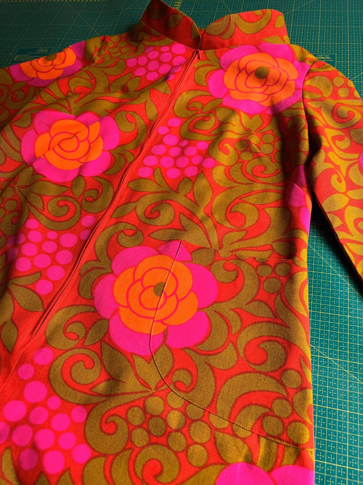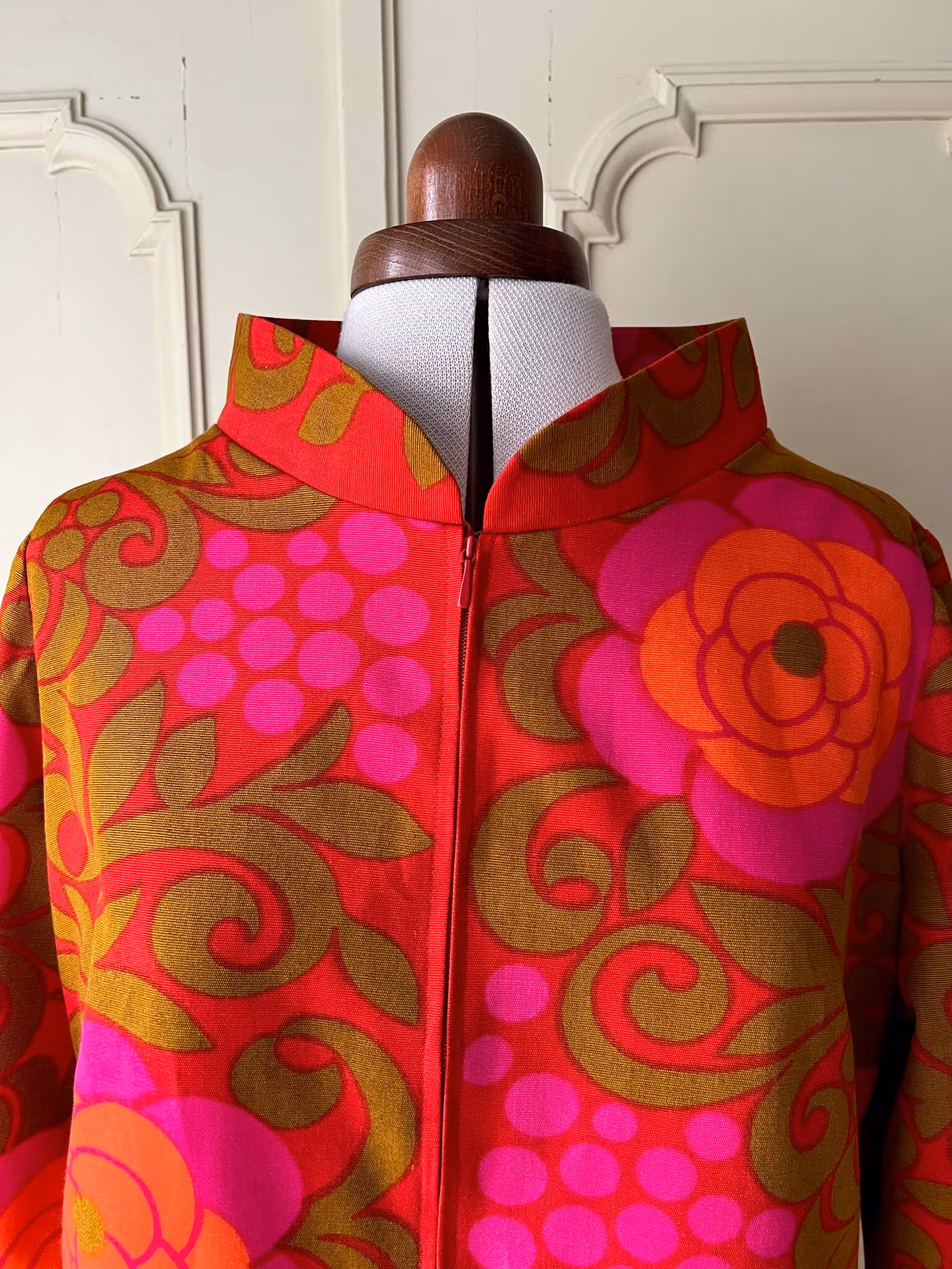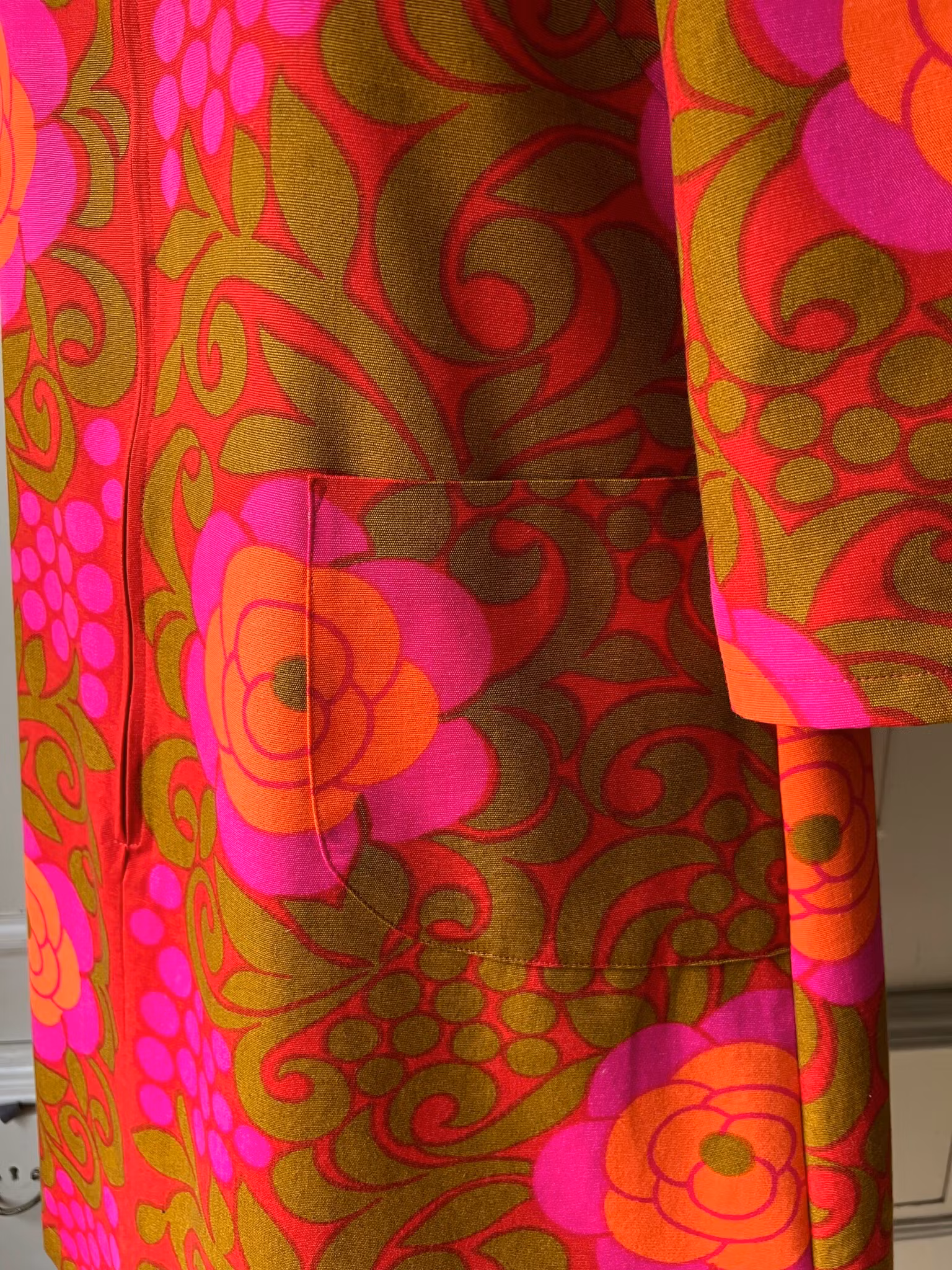 Klänning i A-linjemodell sydd i ett äkta retro/vintagetyg i vävd bomull. Den har en rundad ståkrage och lång dragkedja fram. Små insnitt i ryggen. Ärmen är 3/4 lång. I ena sidan finns en ficka som smälter fint in i tygets mönstrer.
