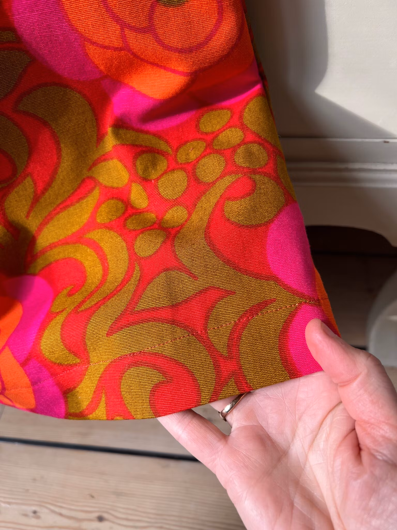Tyget är i mycket fint skick med klara härliga färger. Det var sytt som en gardinlängd men ser knappt ut att ha använts. Designer är Aini Vaari för Finlayson på 1960- eller 70-talet.