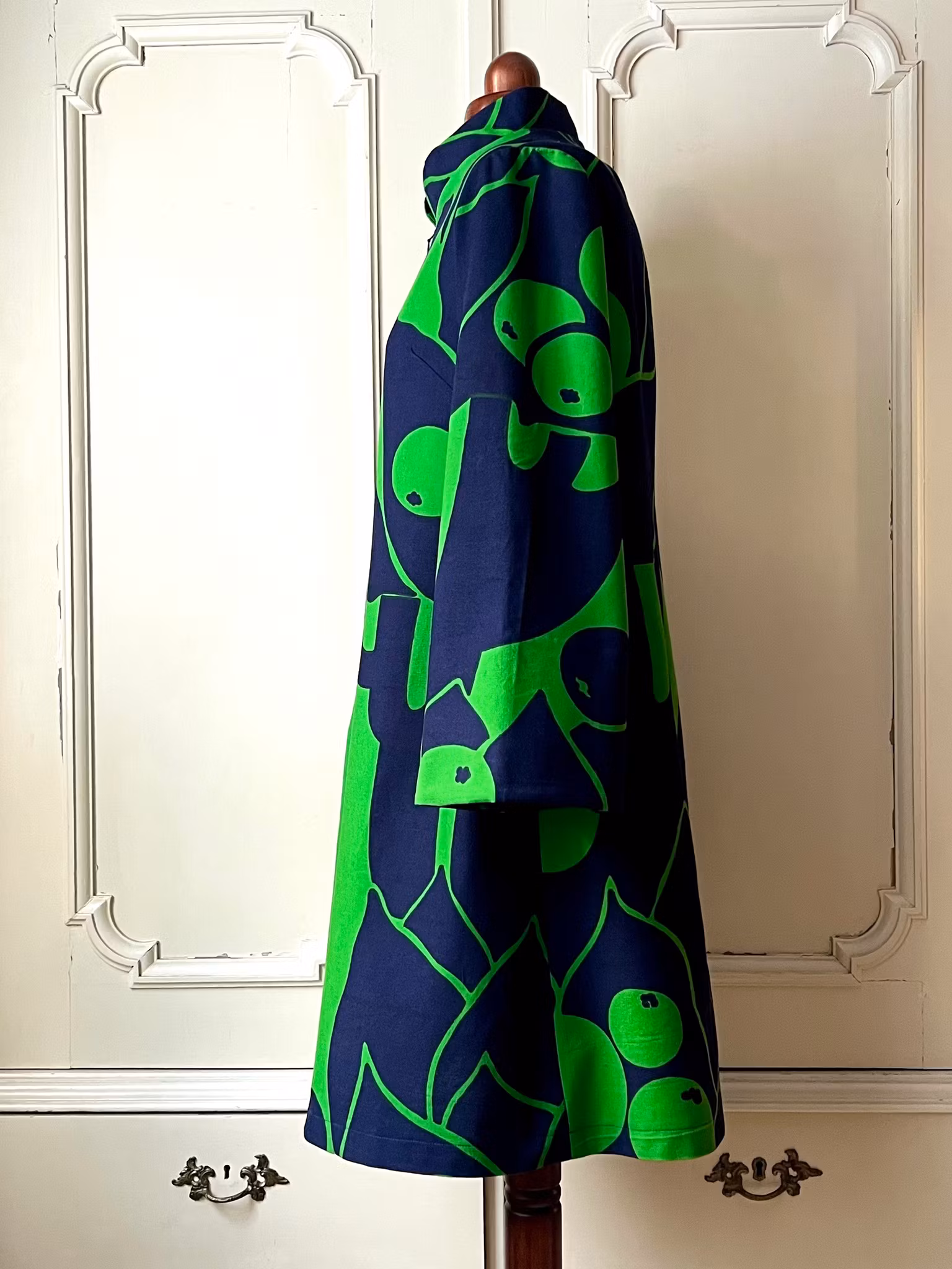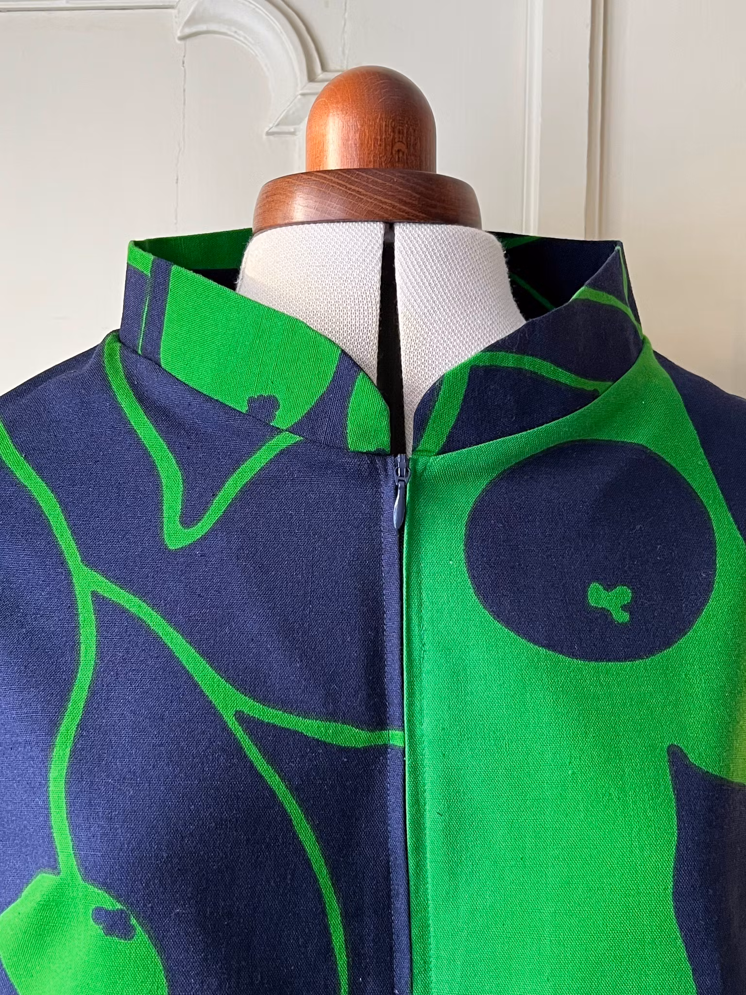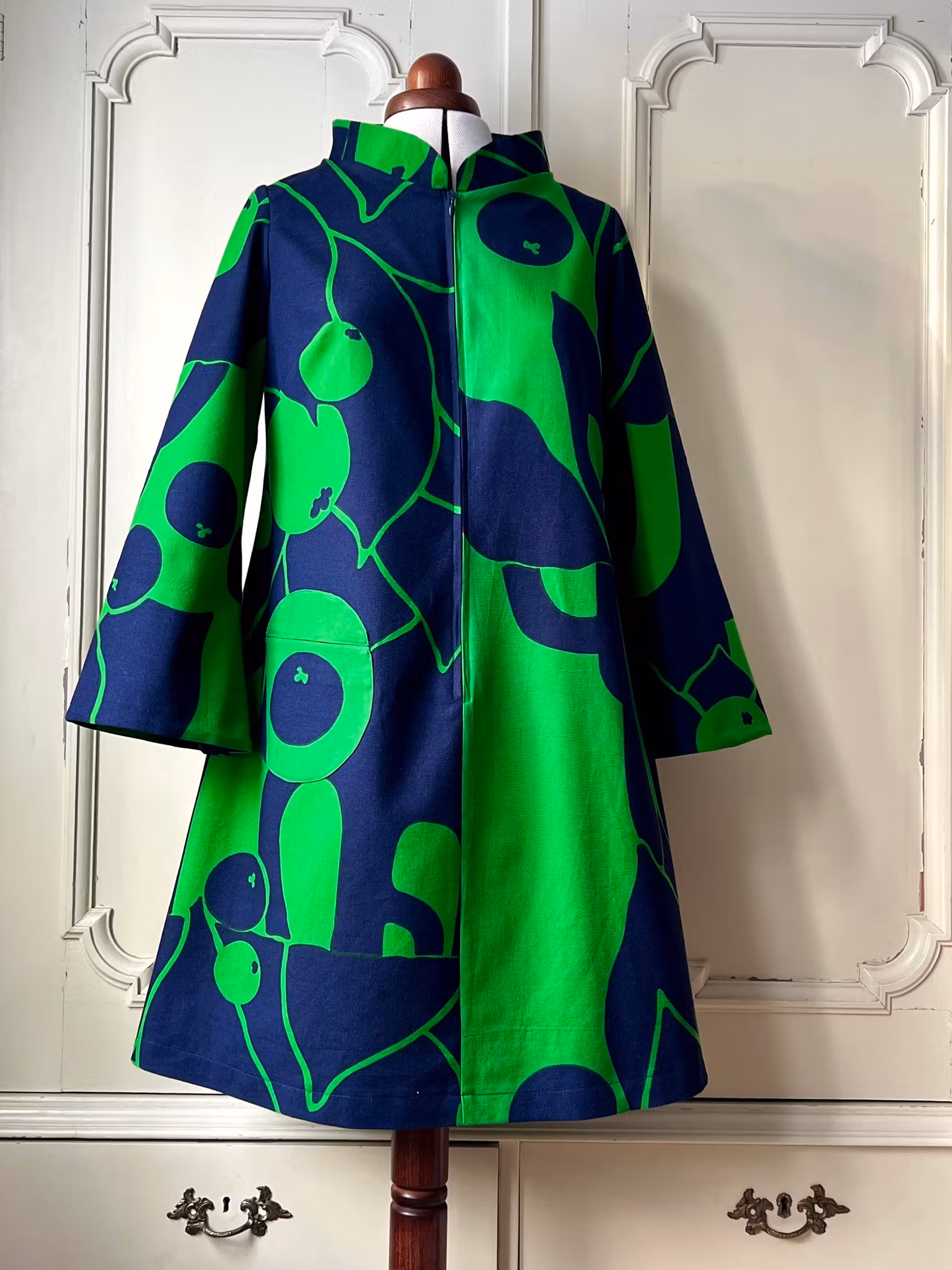 Klänning i A-linjemodell sydd i ett äkta retro/vintage-tyg från 1960- eller 70-talet, i vävd bomull. Klänningen har en fin ståkrage och lång dragkedja fram. Den har lång ärm med mycket vidd nertill samt en infodring som går en bra bit upp och som har handfållats fast på insidan av ärmen. En rund ficka finns som fin detalj på ena sidan framtill. Små insnitt i ryggen för svagt välvd linje.