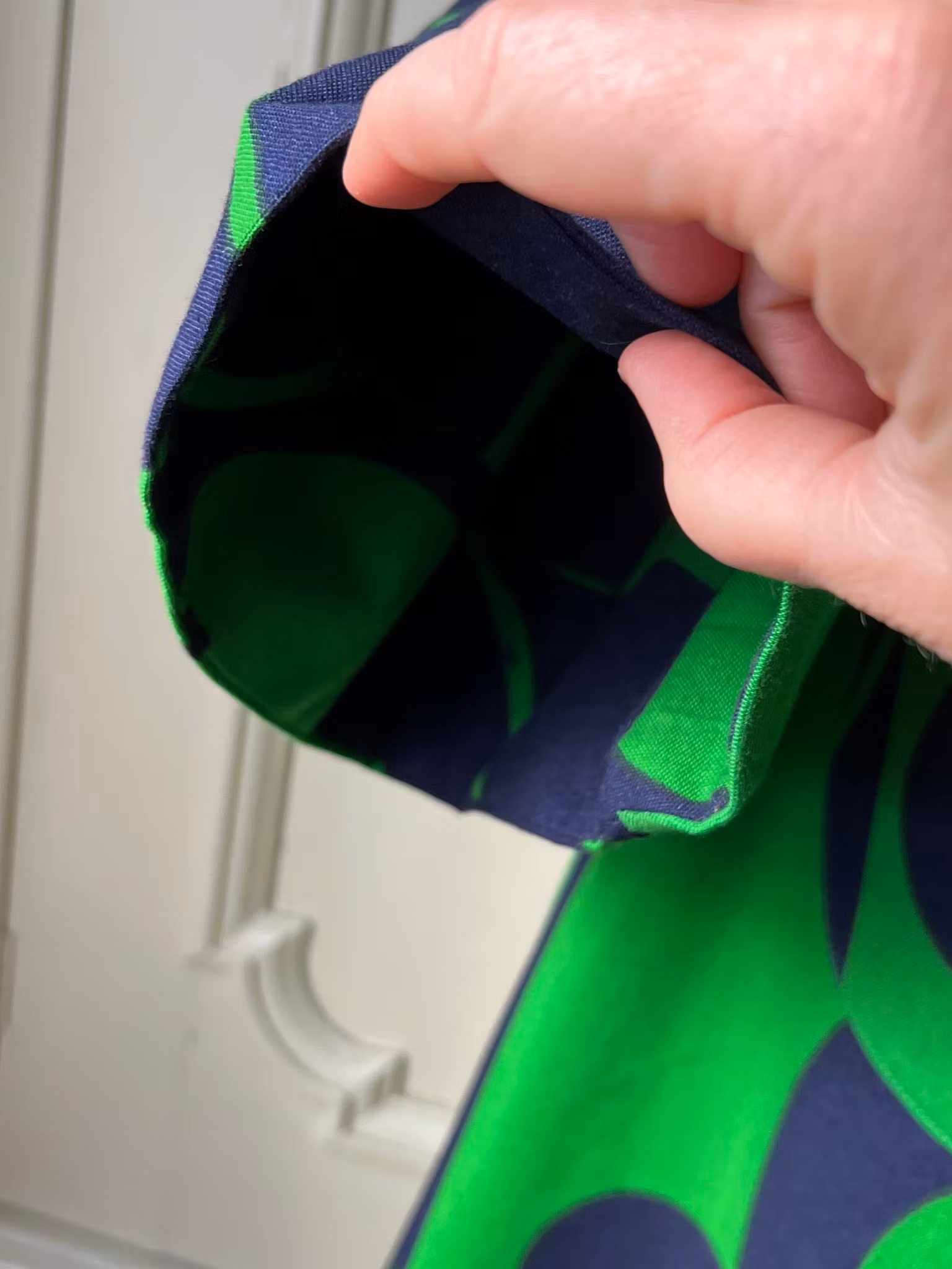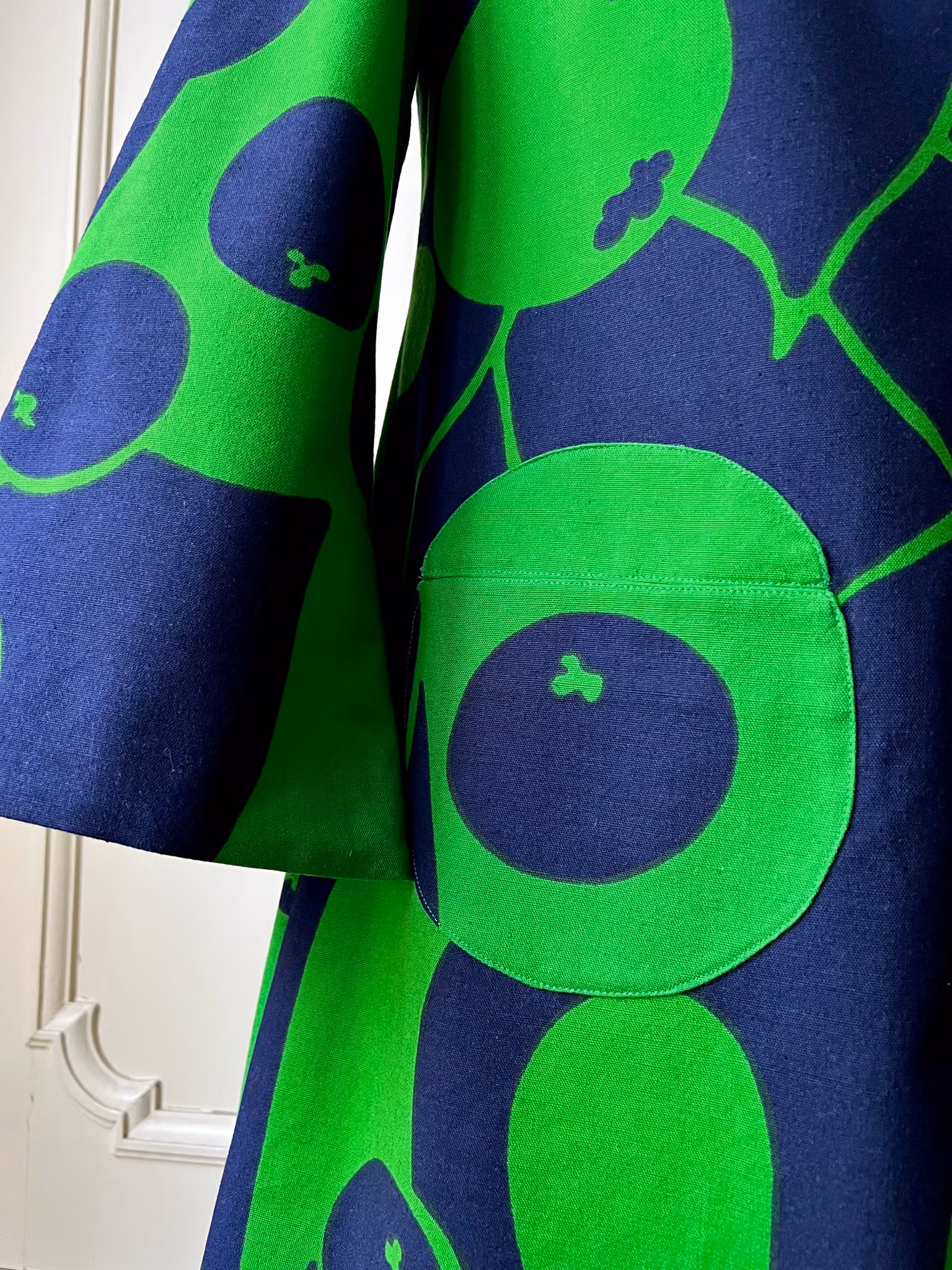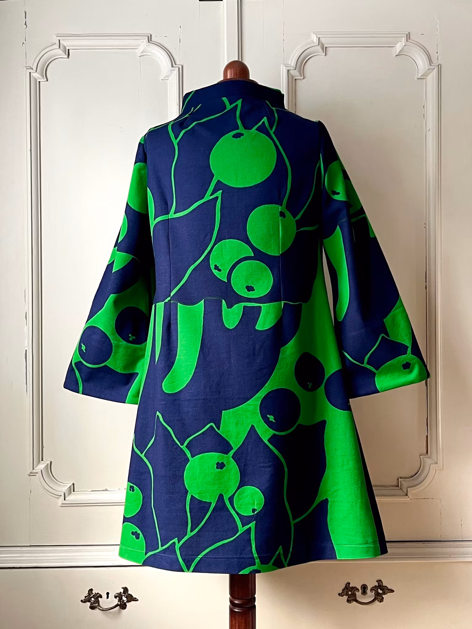 Klänning i A-linjemodell sydd i ett äkta retro/vintage-tyg från 1960- eller 70-talet, i vävd bomull. Klänningen har en fin ståkrage och lång dragkedja fram. Den har lång ärm med mycket vidd nertill samt en infodring som går en bra bit upp och som har handfållats fast på insidan av ärmen. En rund ficka finns som fin detalj på ena sidan framtill. Små insnitt i ryggen för svagt välvd linje.