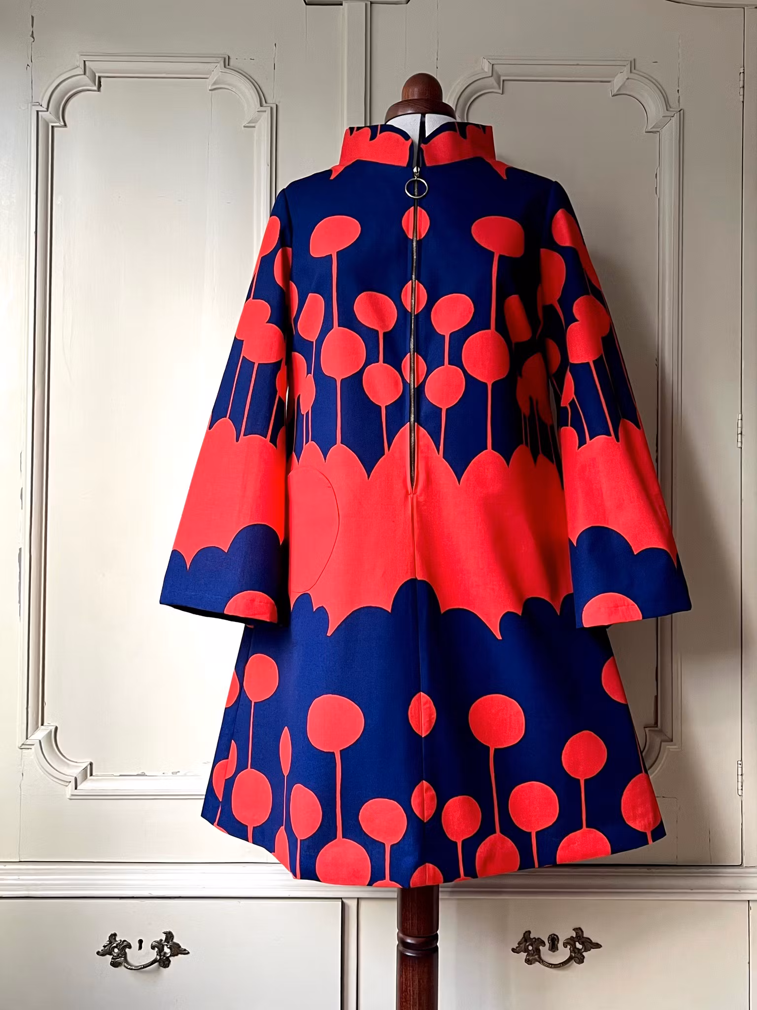 Den har en ståkrage och dragkedja med ring i metall framtill, även den äkta retro. Klänningen har hellång ärm med vidd nertill. Den har också en helt rund ficka som smälter in väl genom att ha samma färg som tyget under.