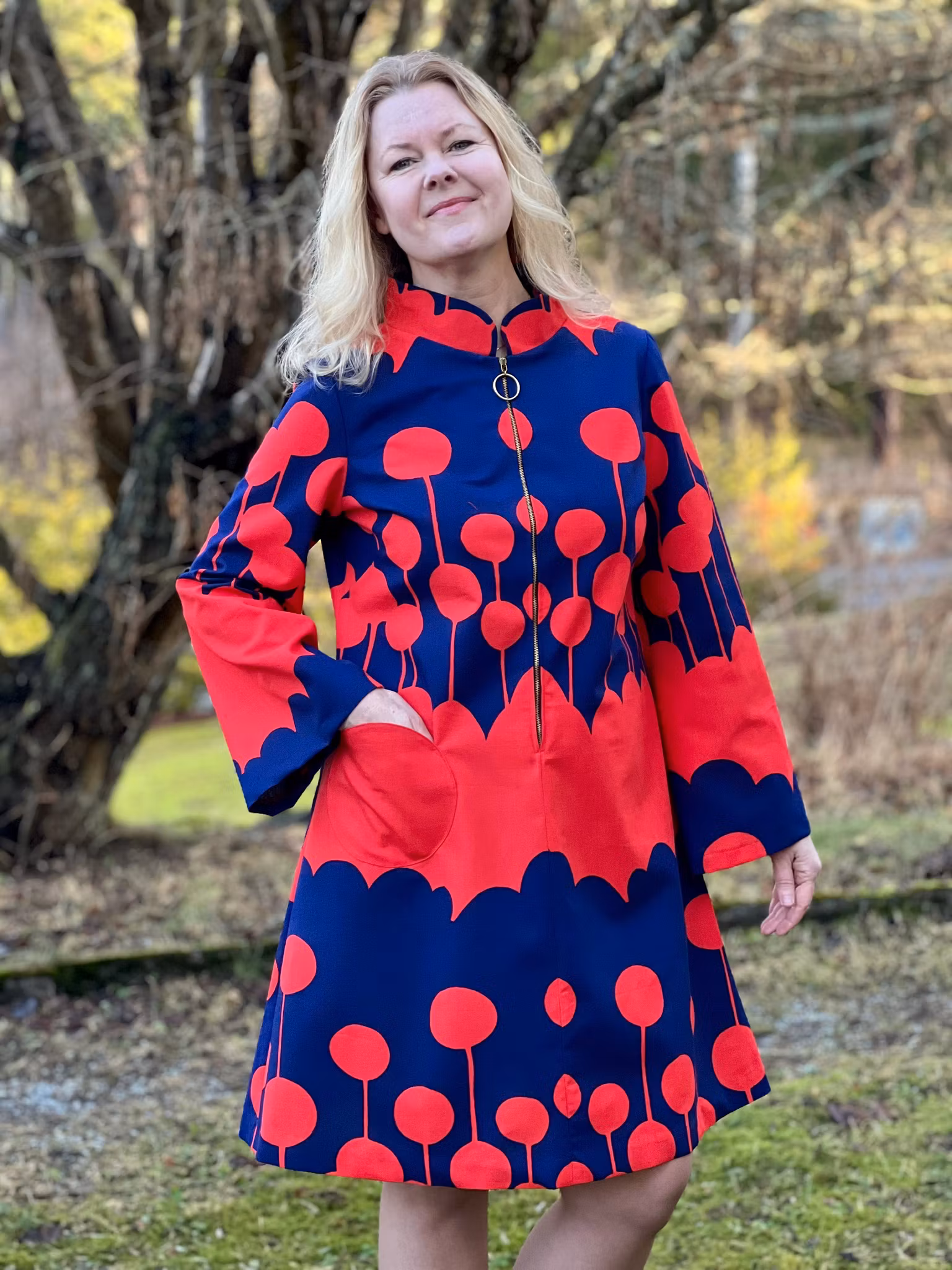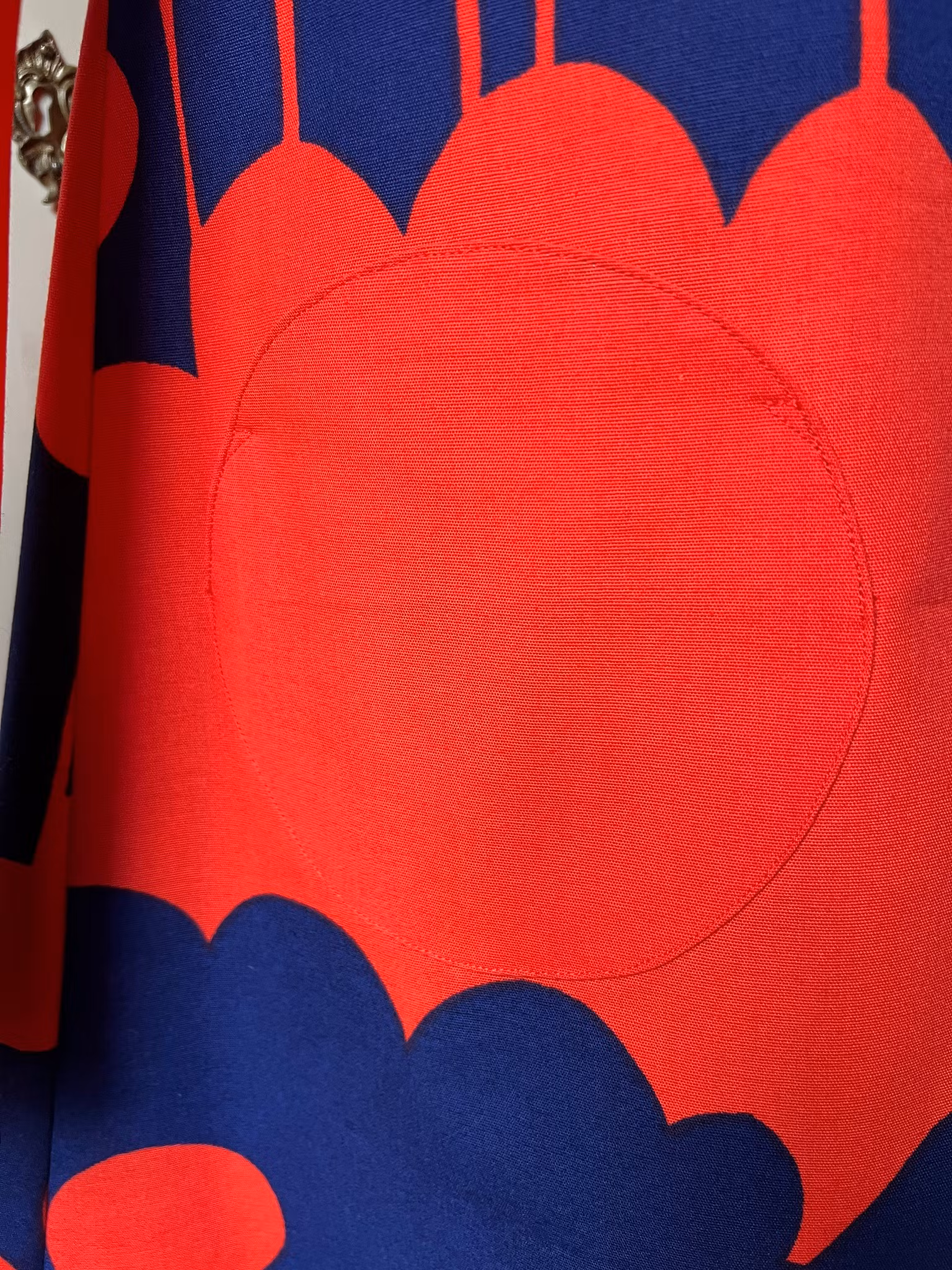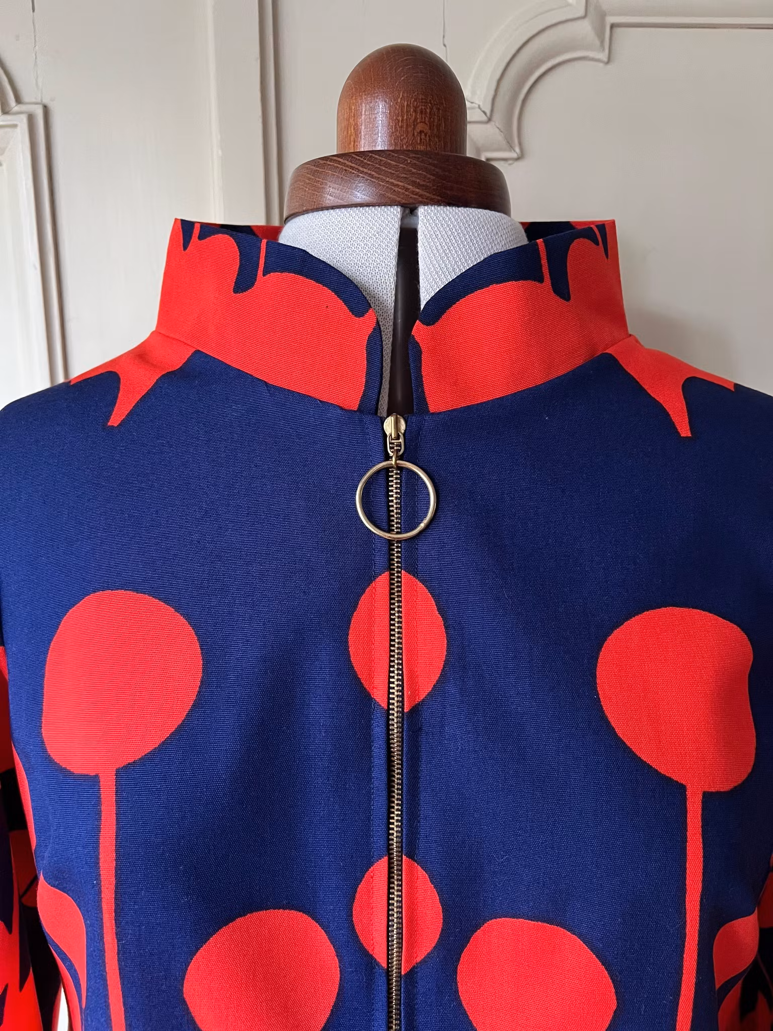 Mycket omsorg har lagts på detaljerna såsom mönsterpassning och växelvis röd och blå söm på dragkedja och ärm för att inte störa mönstret. Dold handsydd fåll nertill.