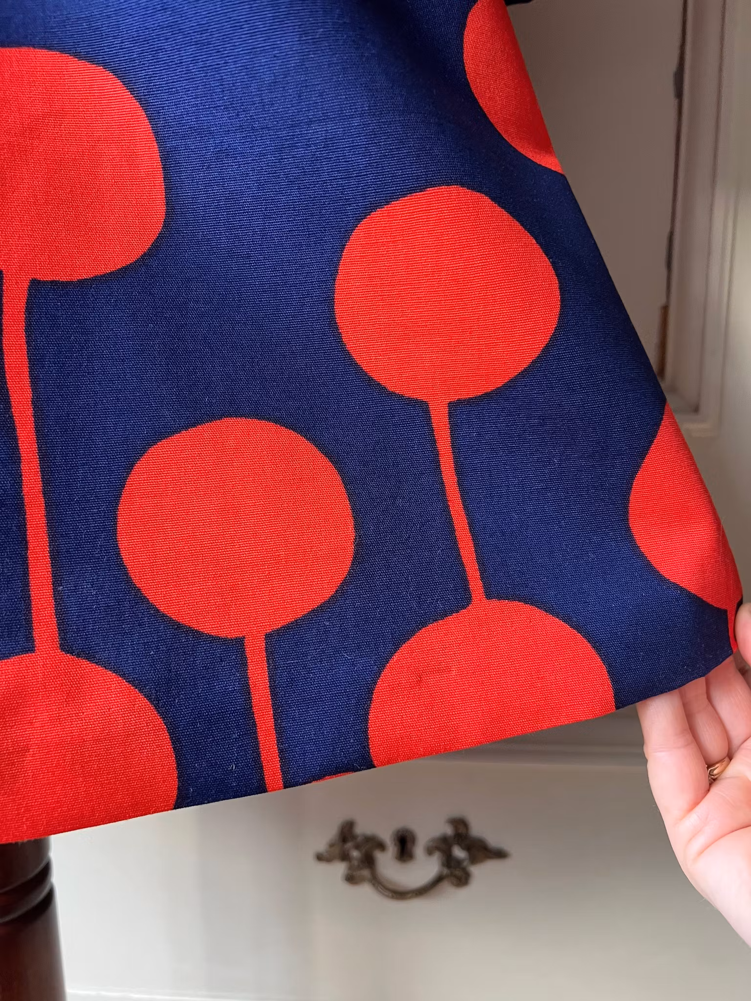 Klänning i A-linjemodell sydd i ett retrotyg i vävd bomull från 1960- eller 70-talet.