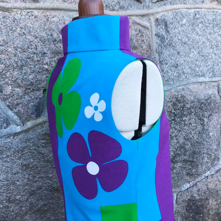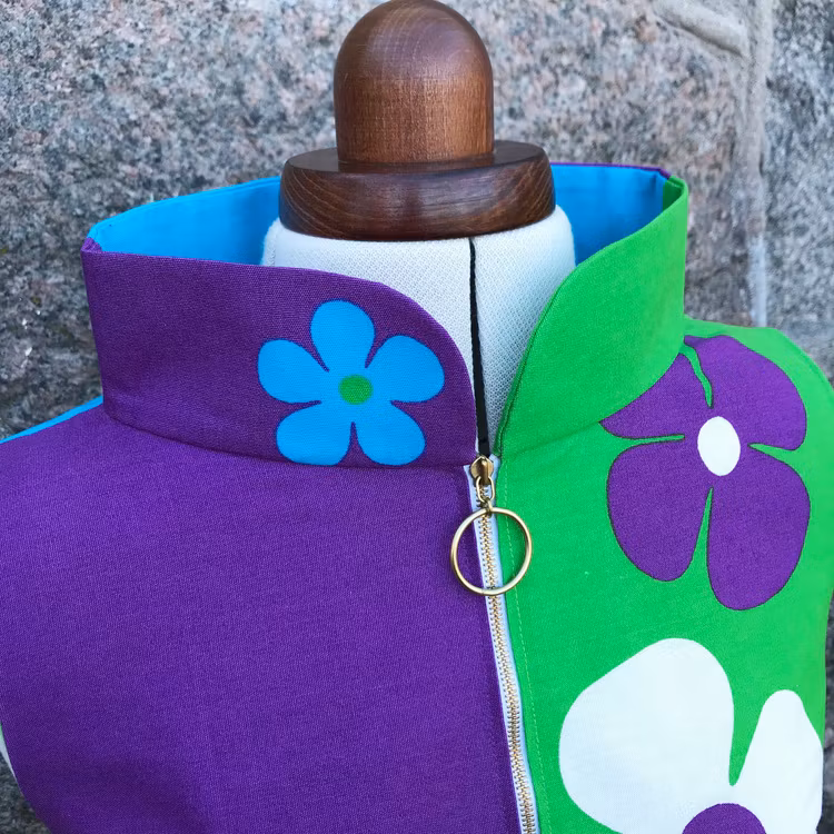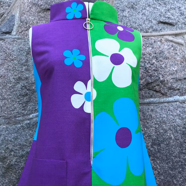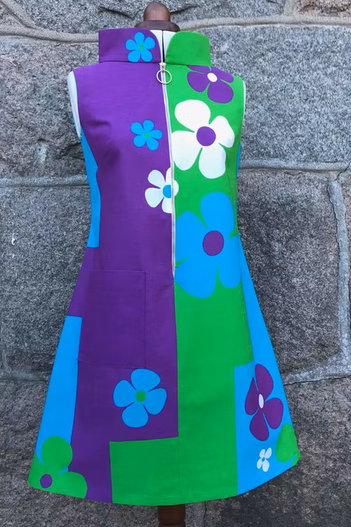 Klänning i A-linjemodell med synlig ringdragkedja fram, rundad, stärkt ståkrage och ficka på ena sidan. Stor vikt har lagts vid detaljer som att sömmen vid dragkedjan sytts i olika färger för att inte störa tygets mönster och en mönsterpassning som gör att mönstrets färglinjer delats i mitten och går ihop där krage och klänning möter varandra. Klänningen har dolda handsydda sömmar på insidan av kragen och nertill. Sydd i ett retrotyg från 1960- eller 70-talet i mycket fint använt skick. Materialet är tätvävd fin bomull.