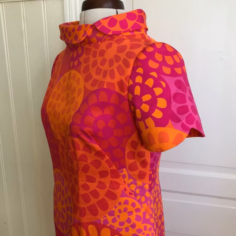 Klänning i A-linjemodell med hög och mjuk krage som är delad hallvägs ner på ena sidan och kan vikas på olika sätt. Klänningen har lite längre och djupare bystinsnitt samt små insnitt i midjan för en något mer figurnära passform. Klänningen har dragkedja bak samt knapp upptill i kragen bak. Den har en kort ärm som är rundad nertill för fin effekt. Klänningen har dold handsydd fåll nertill. Tyget är designat av Marjatta Metsovaara och heter Kukka (blomma). Det kom för första gången ut på 1960-talet men detta är ett nytryck av Metsovaara. Materialet är mellankraftig bomull med satinyta som ger en vacker lyster.