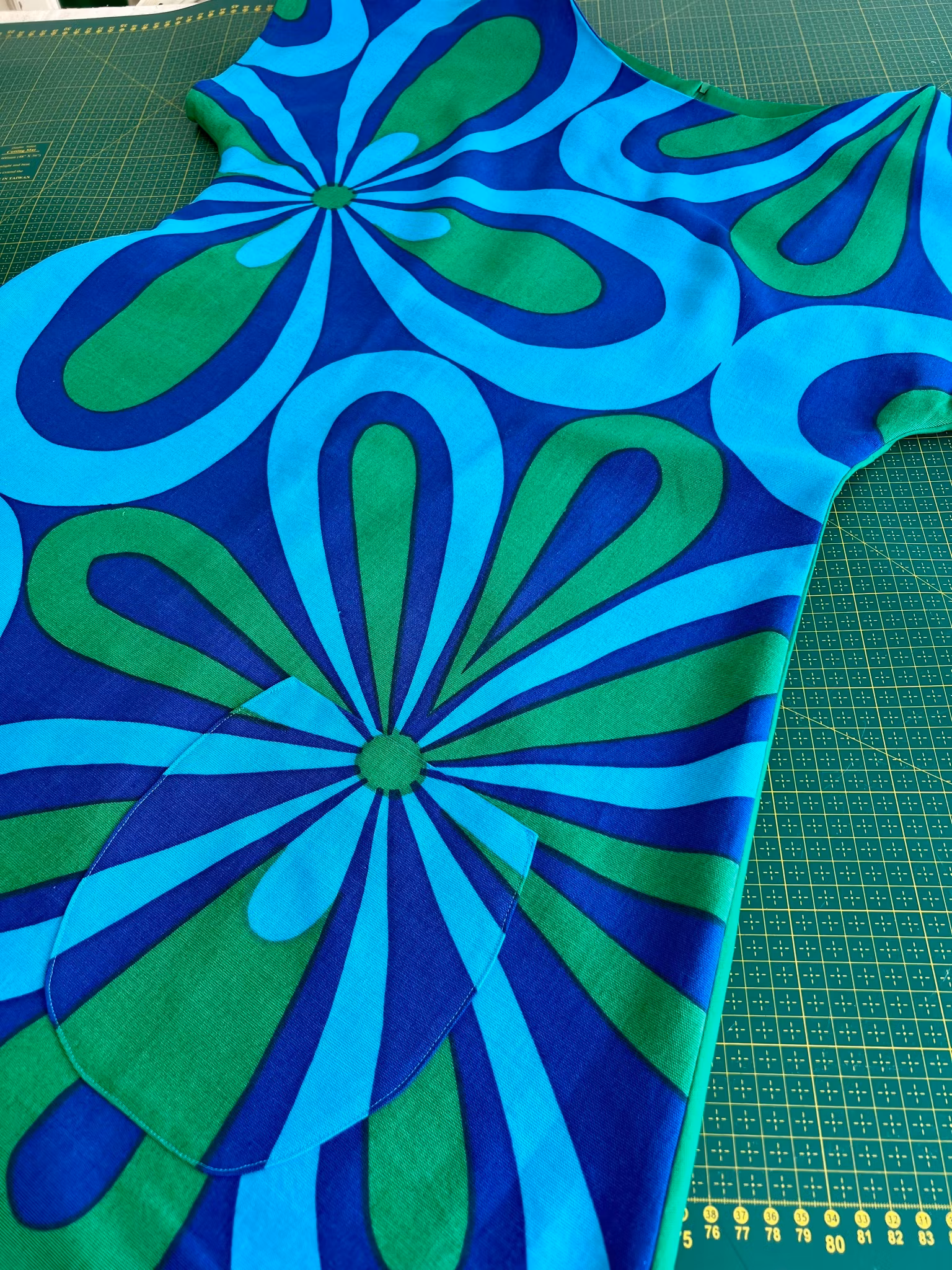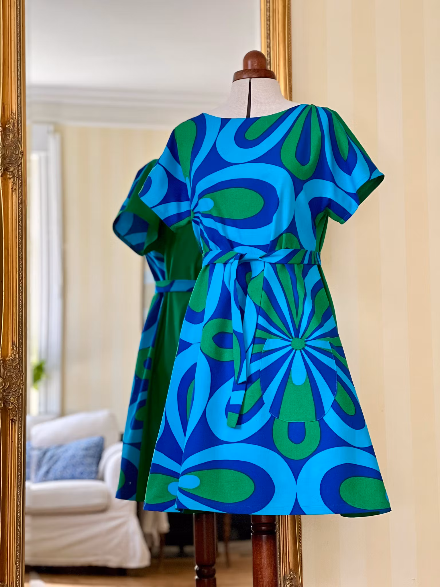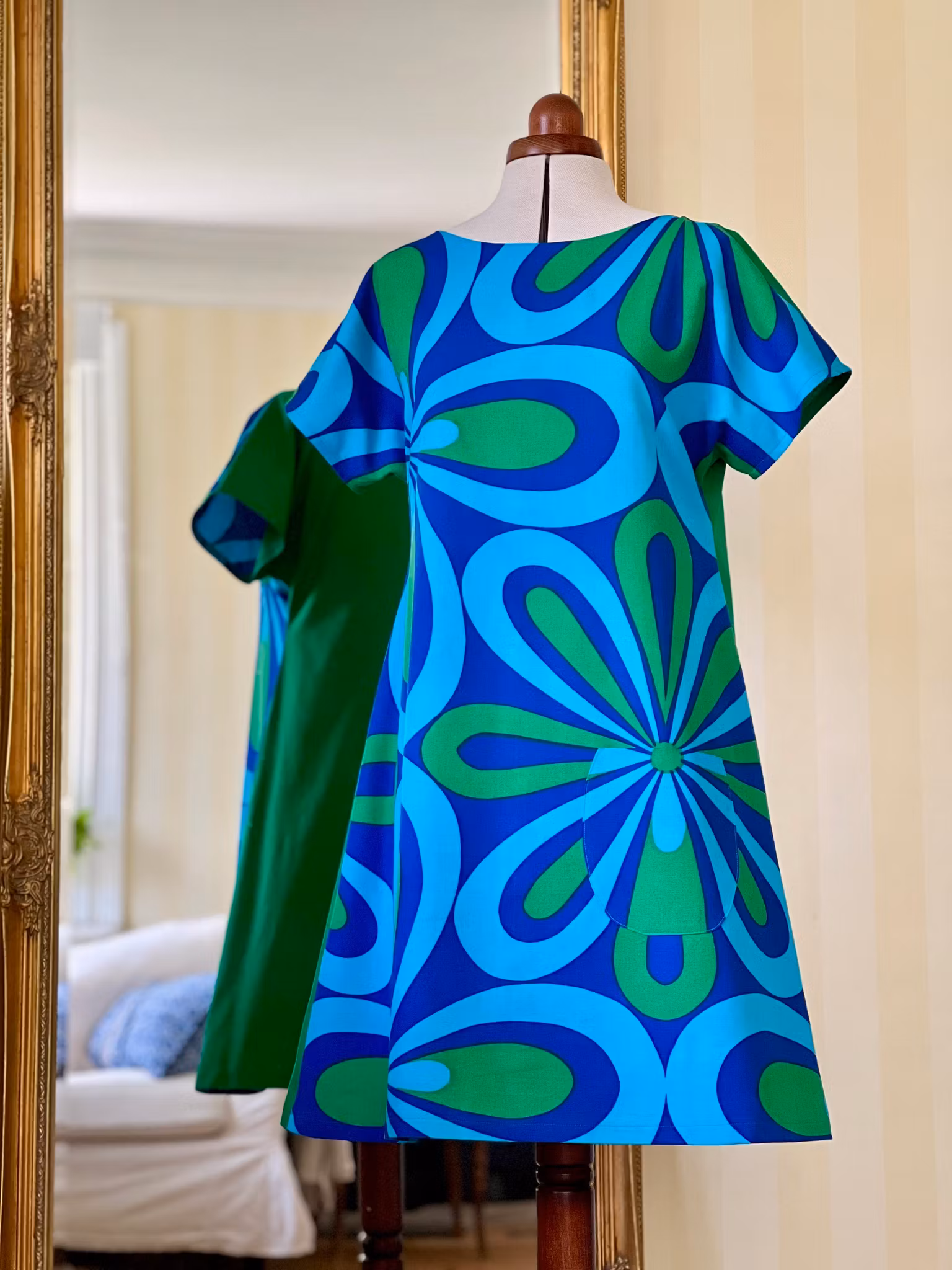 För att inte bryta det härliga mönstret är klänningen sydd med ärm och fram/bak-del i sammanhängande stycken.