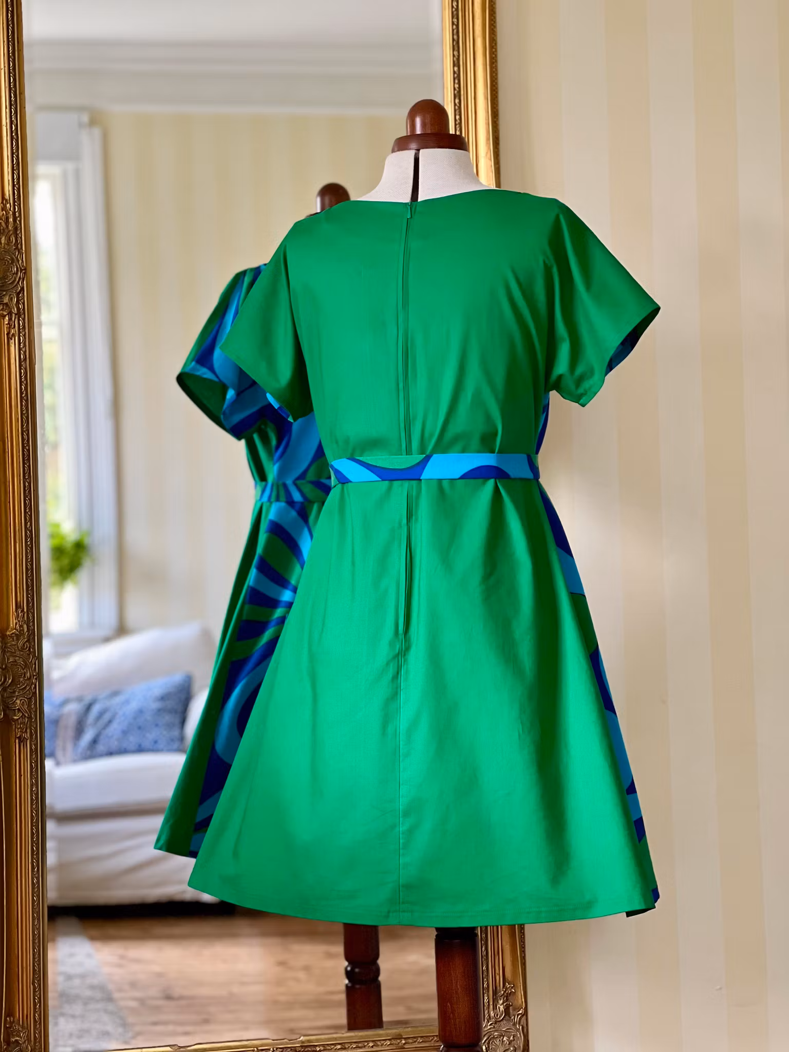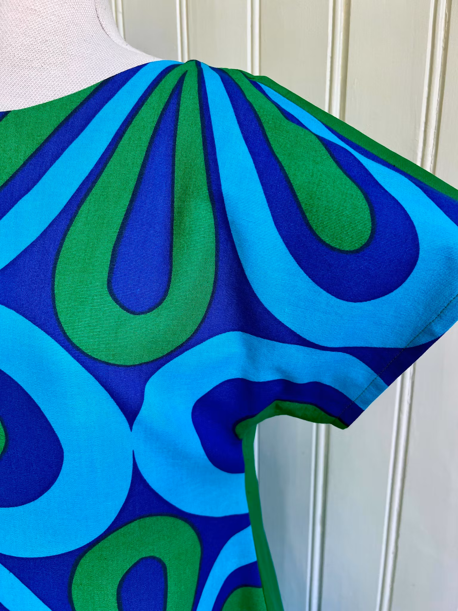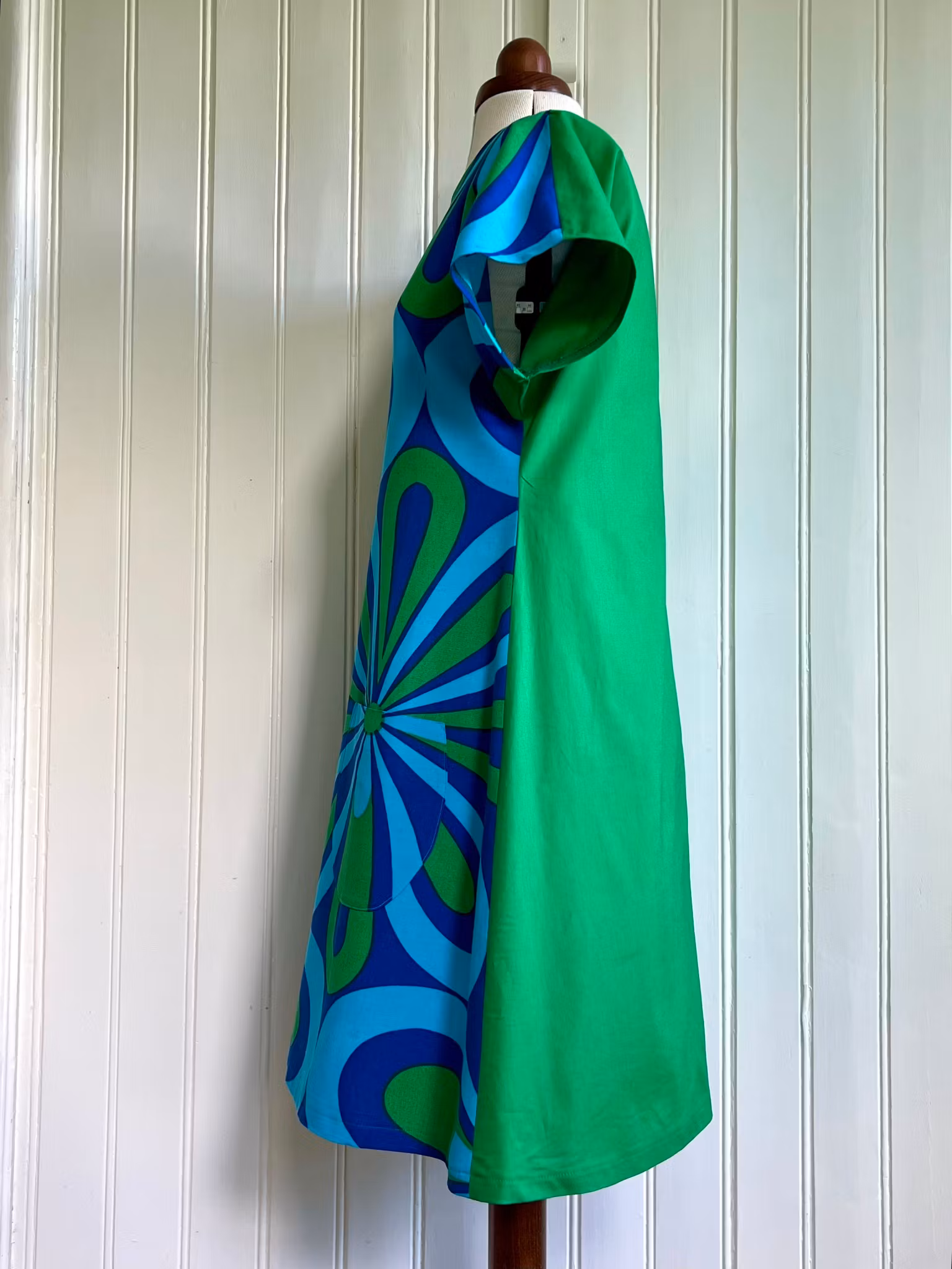 För att inte bryta det härliga mönstret är klänningen sydd med ärm och fram/bak-del i sammanhängande stycken.