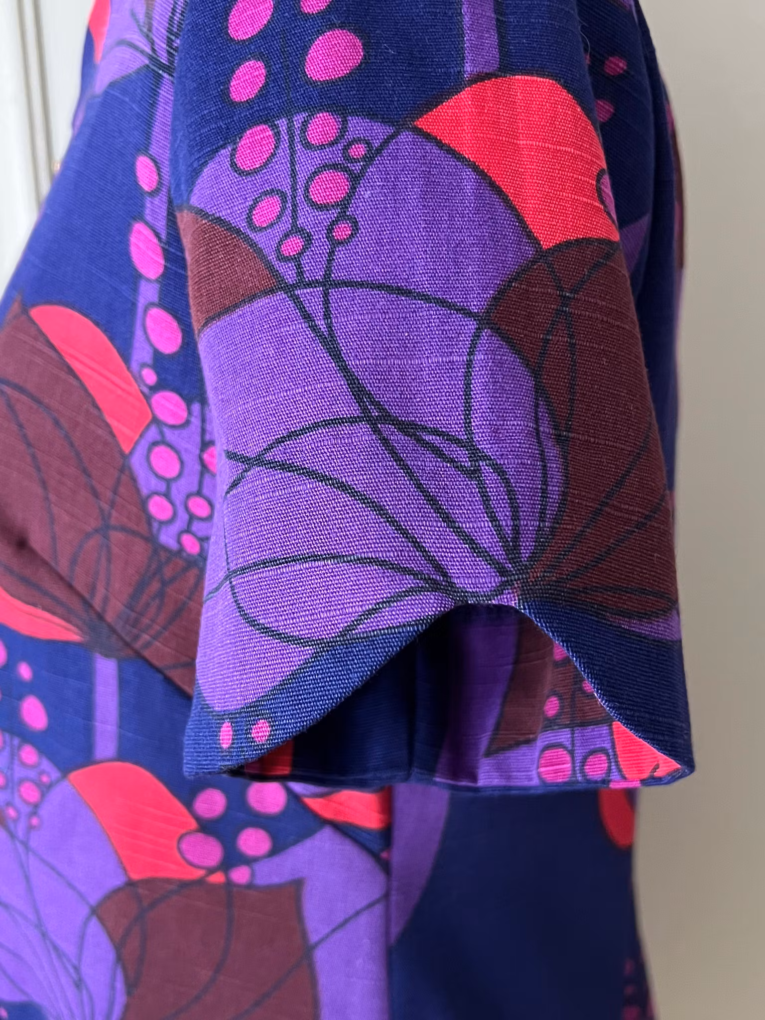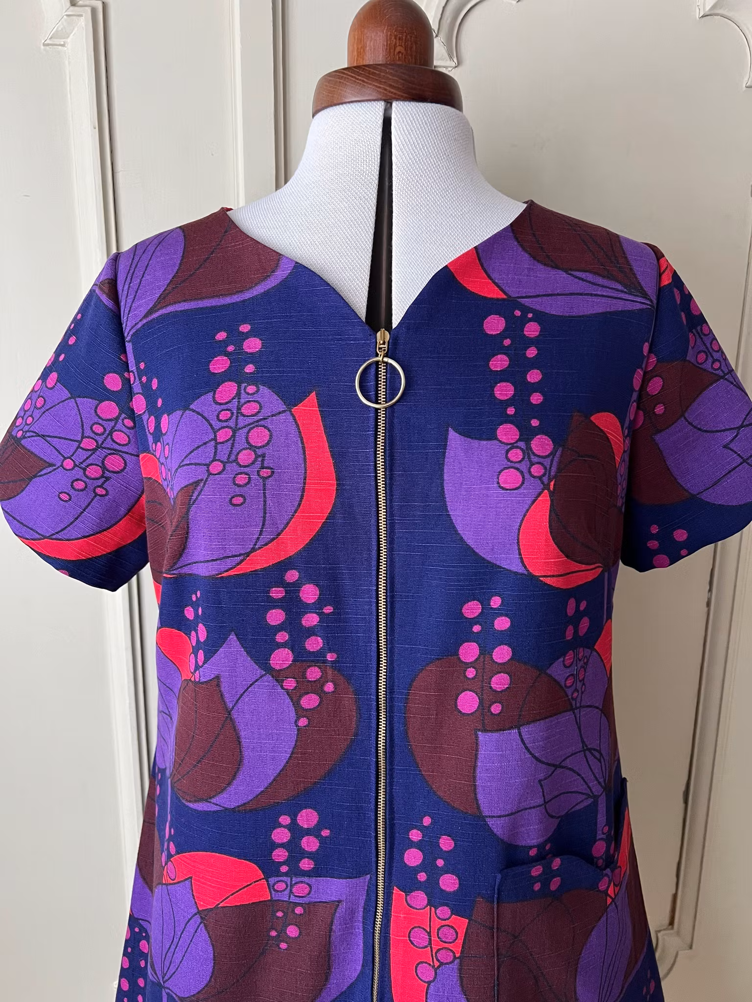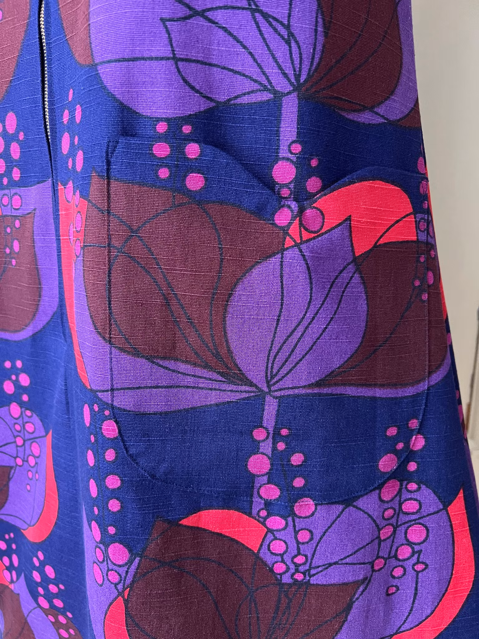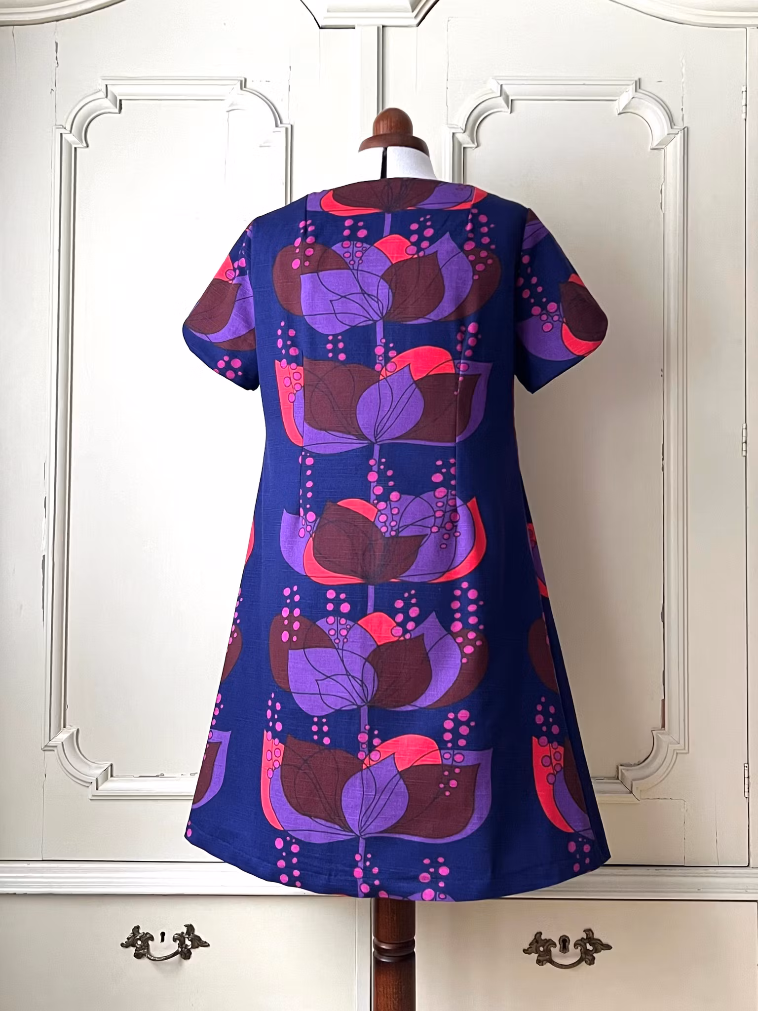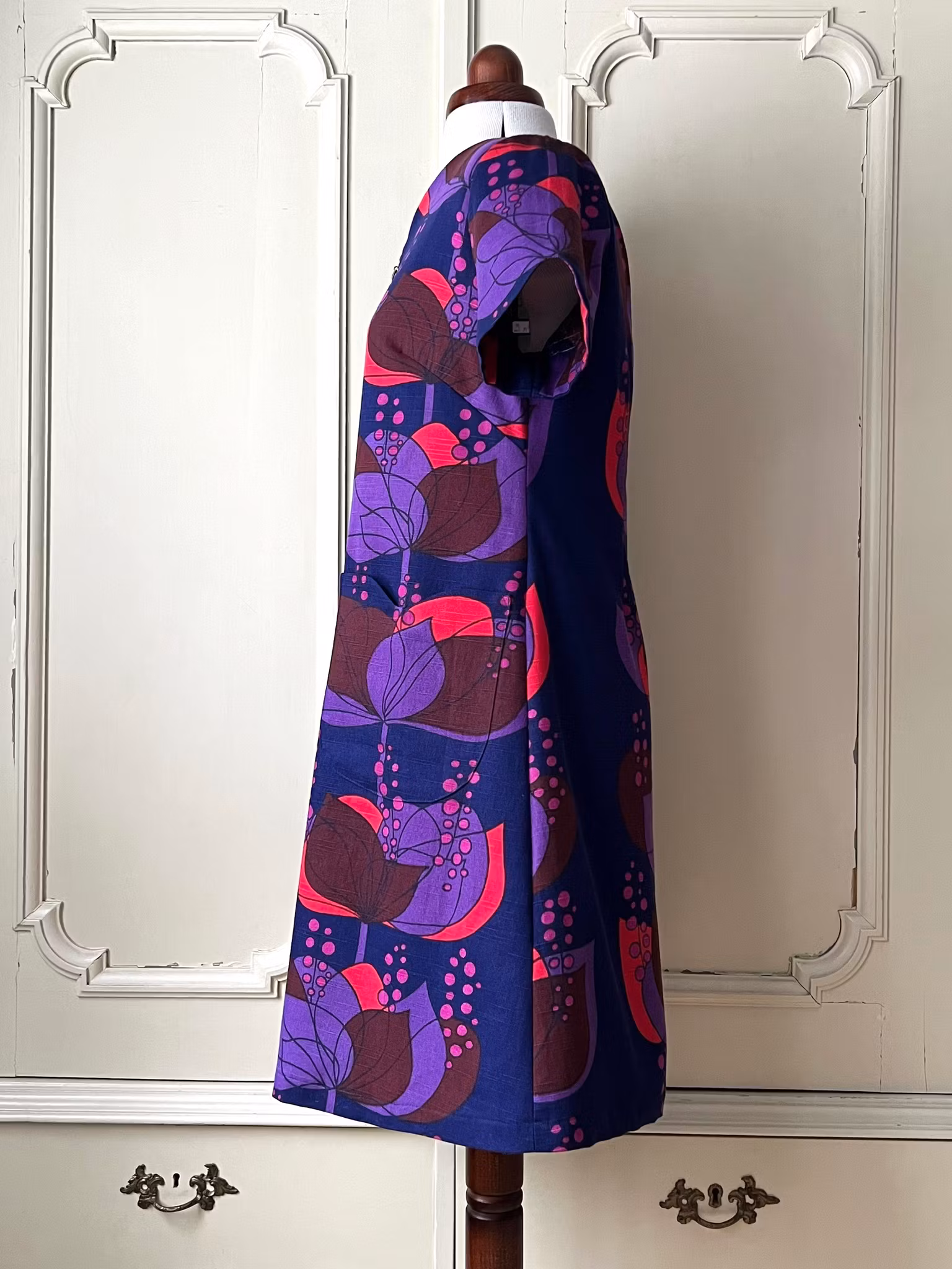 Klänning i A-linjemodell sydd i ett äkta retrotyg i vävd bomull. Klänningen har välvda linjer i hals- och ärmringning samt på den rymliga fickan som finns på ena sidan. Fickan är mönsterpassad så att den smälter in och blir mycket diskret.