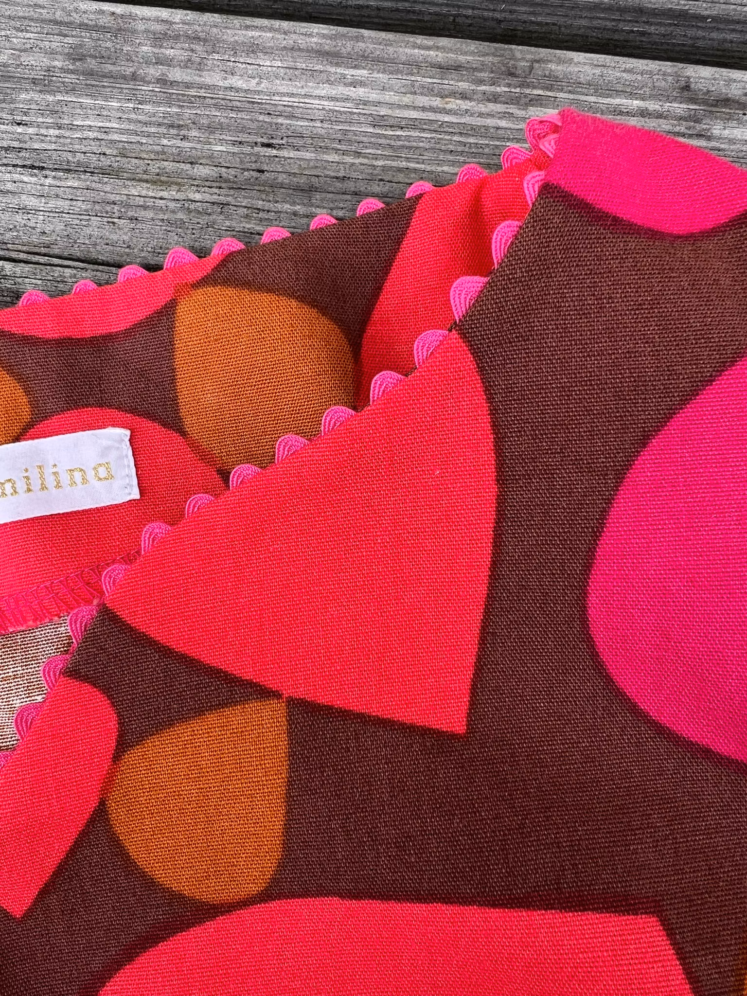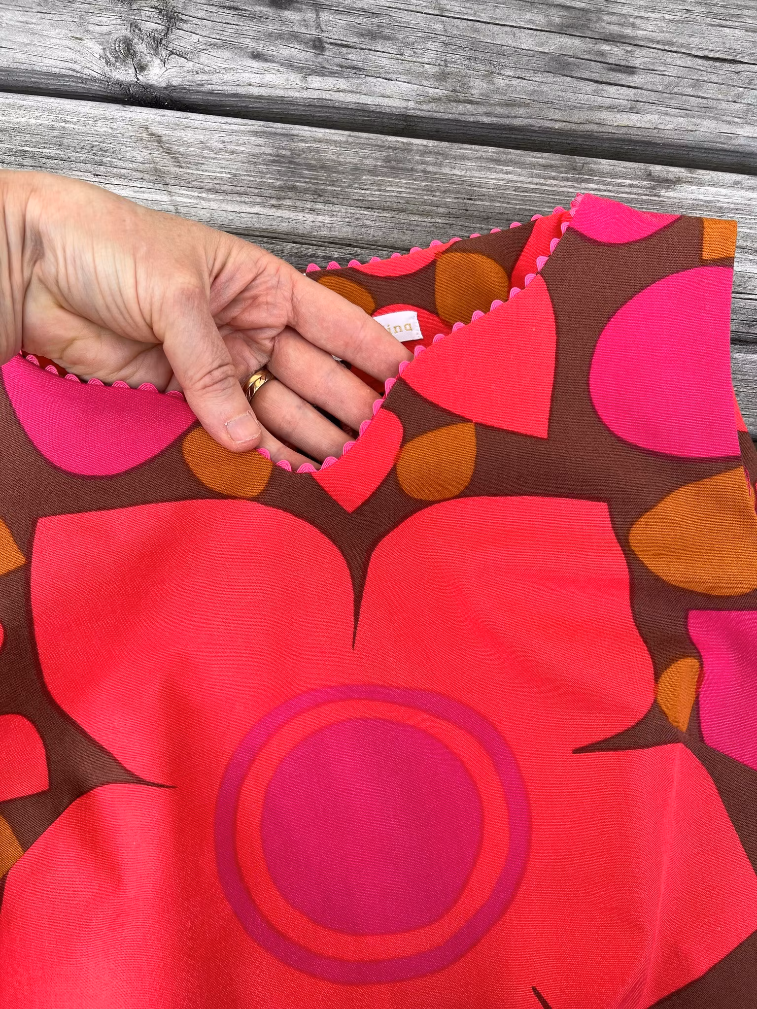 Klänning i A-linjemodell sydd i ett äkta retrotyg, troligtvis från 1960-talet, i vävd bomull.