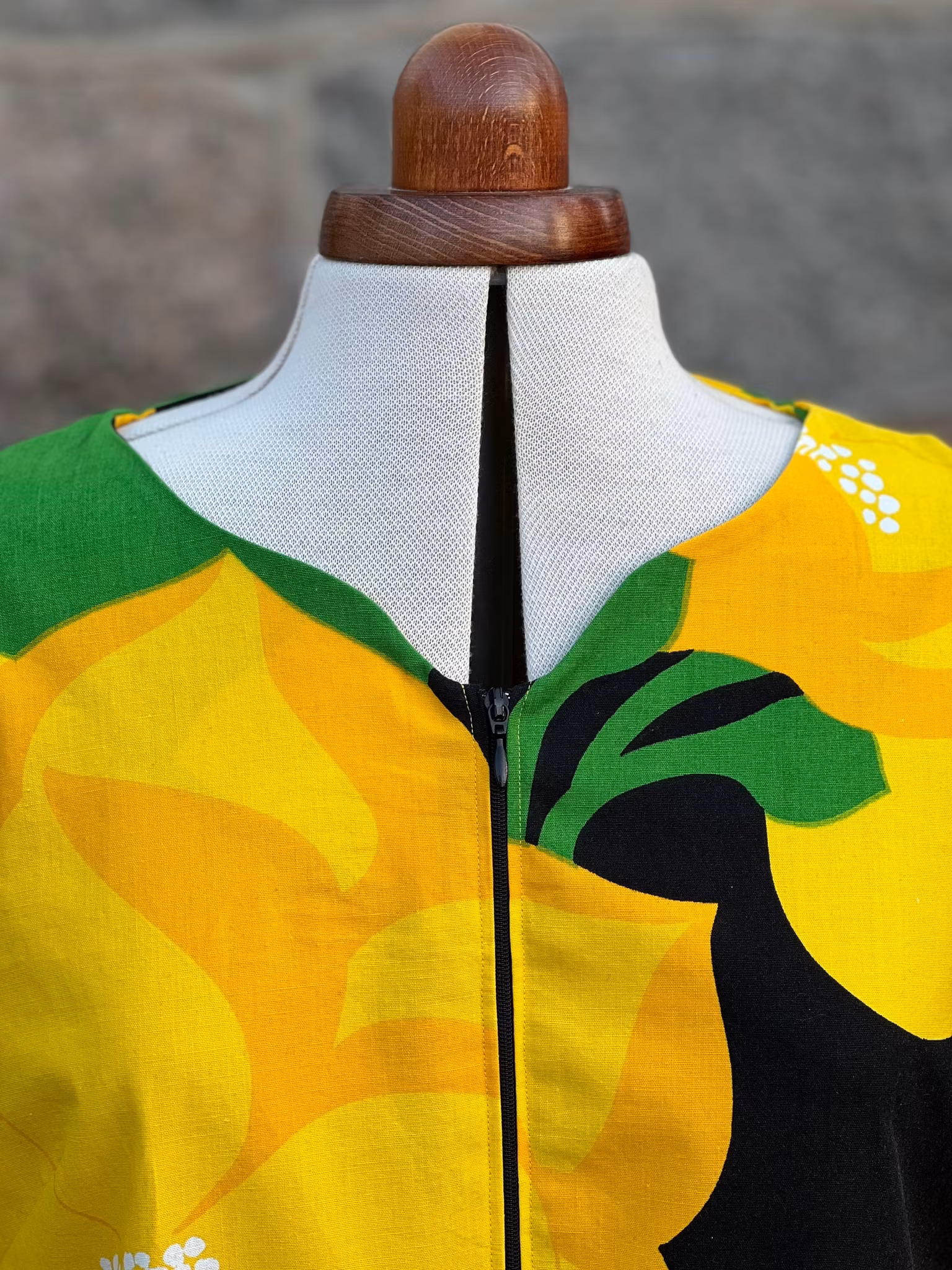 Synlig svart dragkedja fram. En rymlig ficka på ena sidan med välvd linje upptill. Mycket omsorg har lagts på detaljerna, som att fickan är mönsterpassad för att smälta perfekt in.
