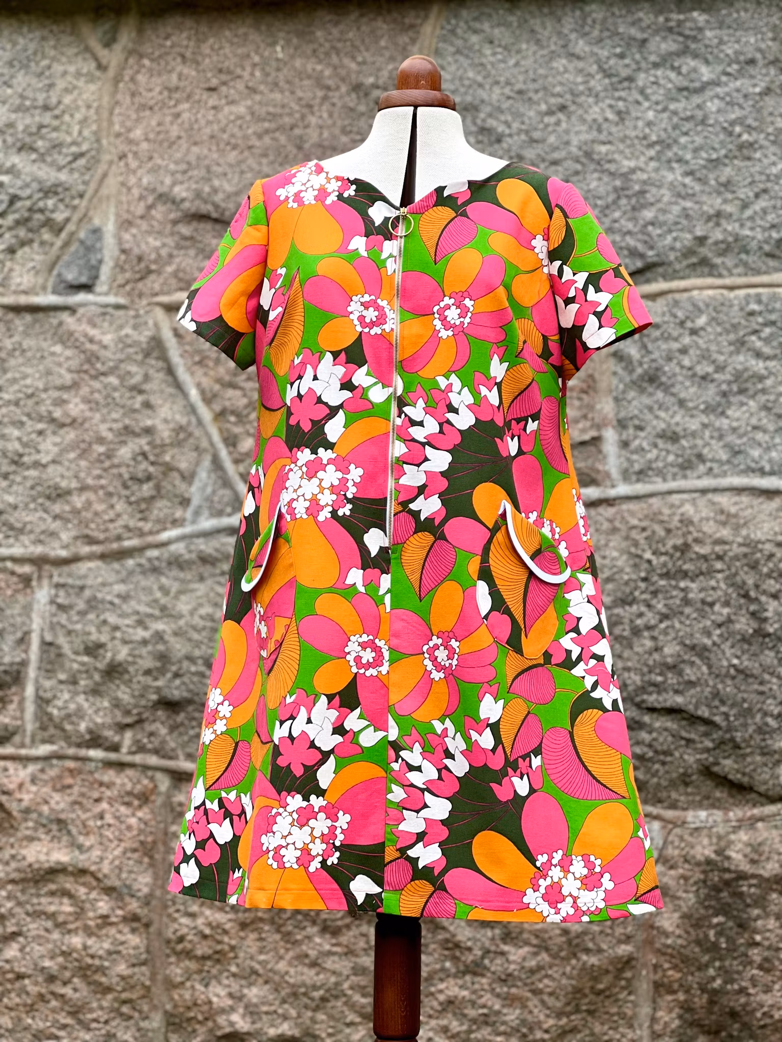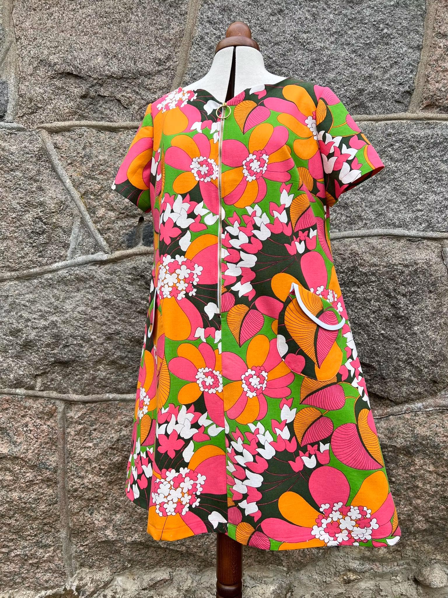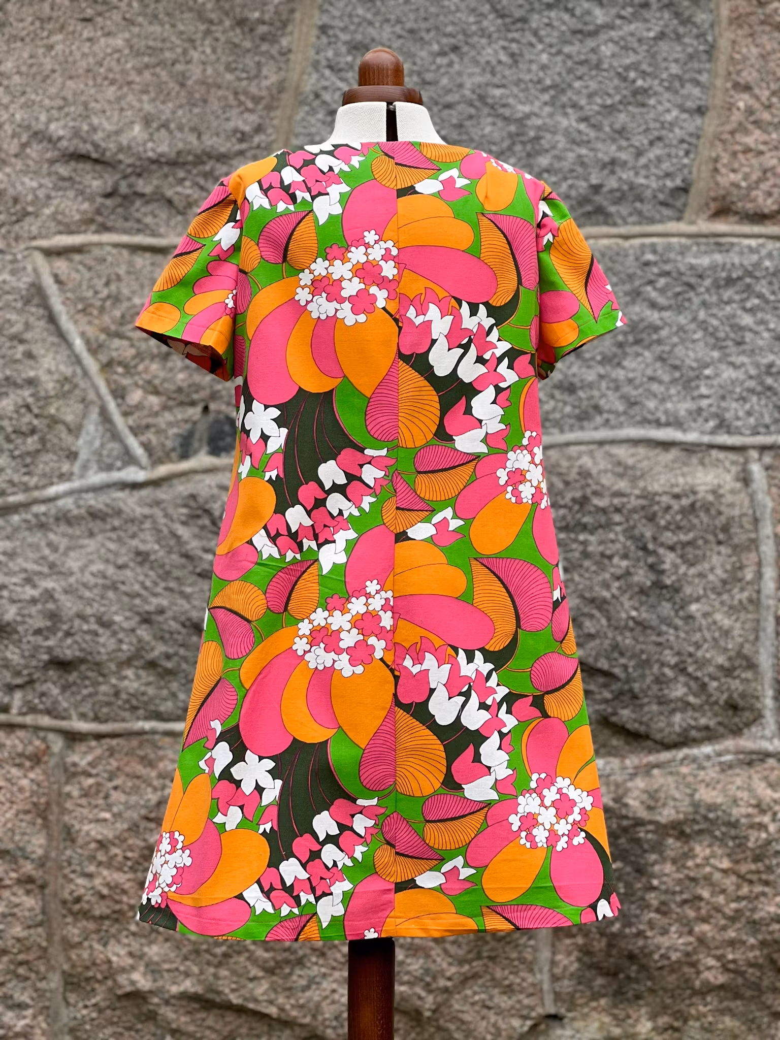Klänning i A-linjemodell sydd i ett äkta retrotyg, troligtvis från 1960-talet, i vävd bomull.
