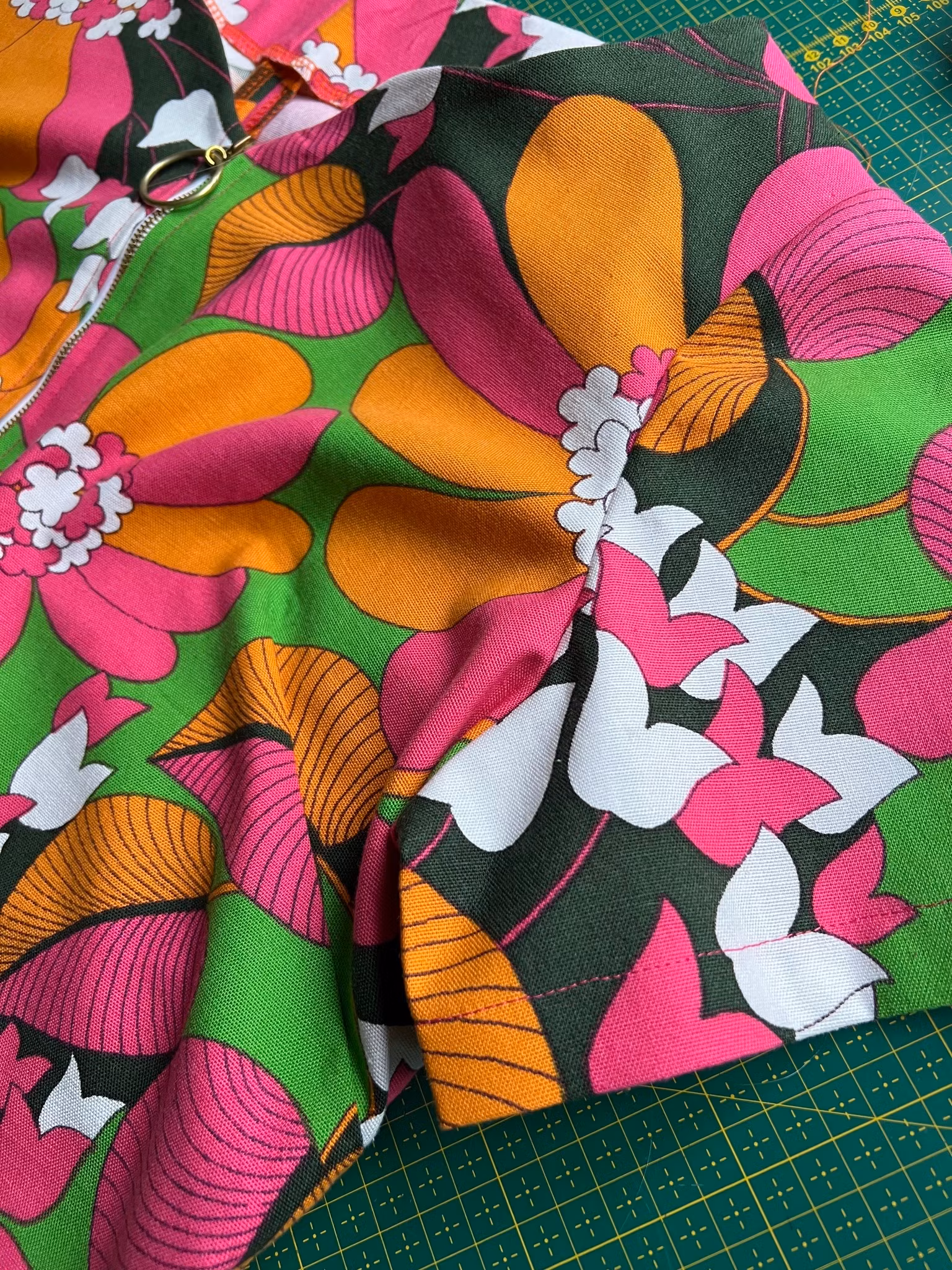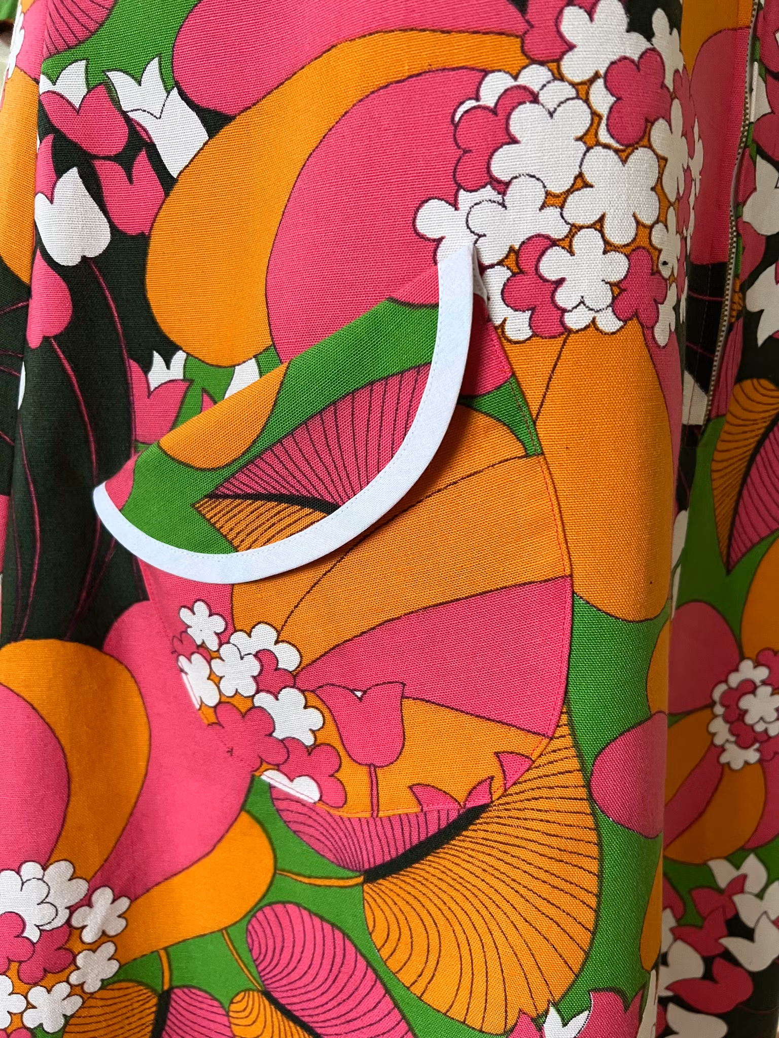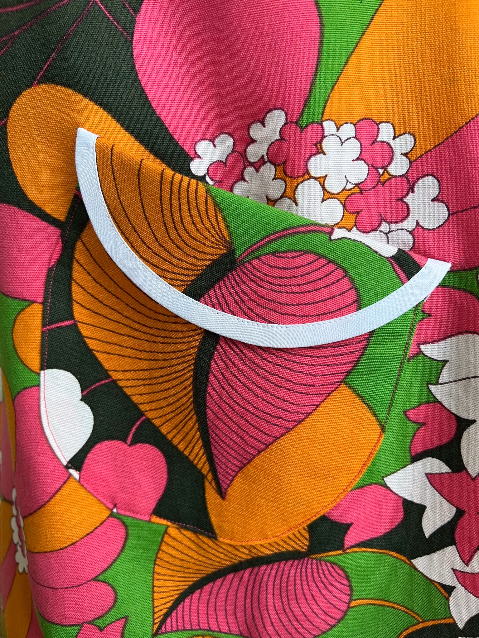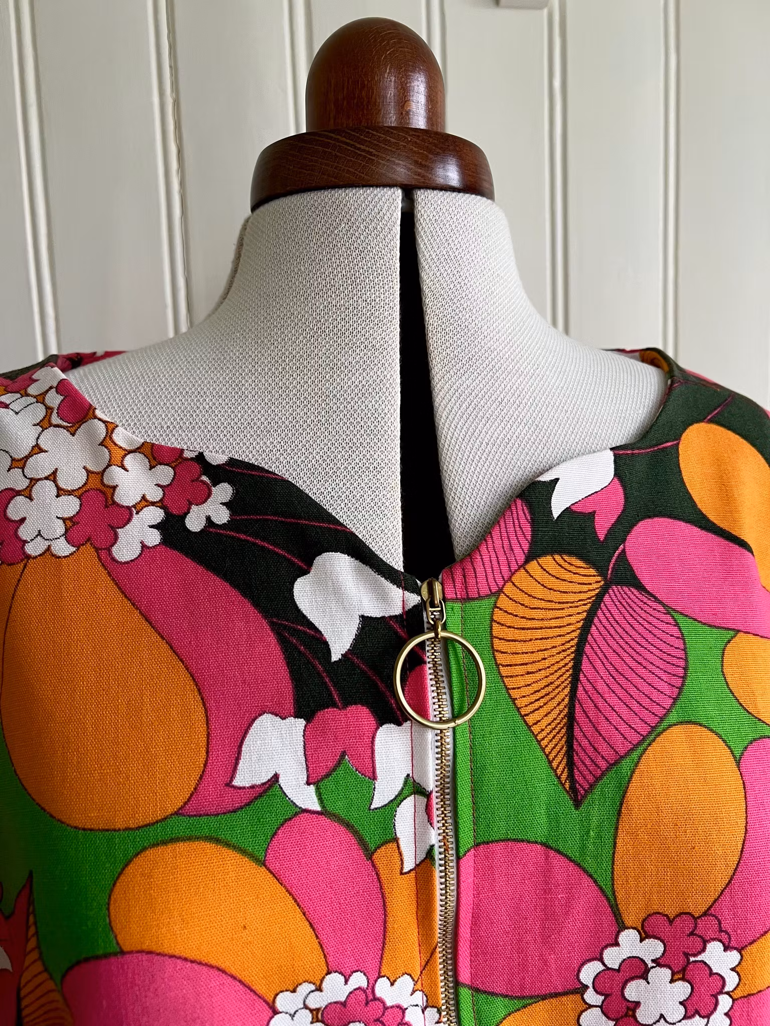 Klänning i A-linjemodell sydd i ett äkta retrotyg, troligtvis från 1960-talet, i vävd bomull.