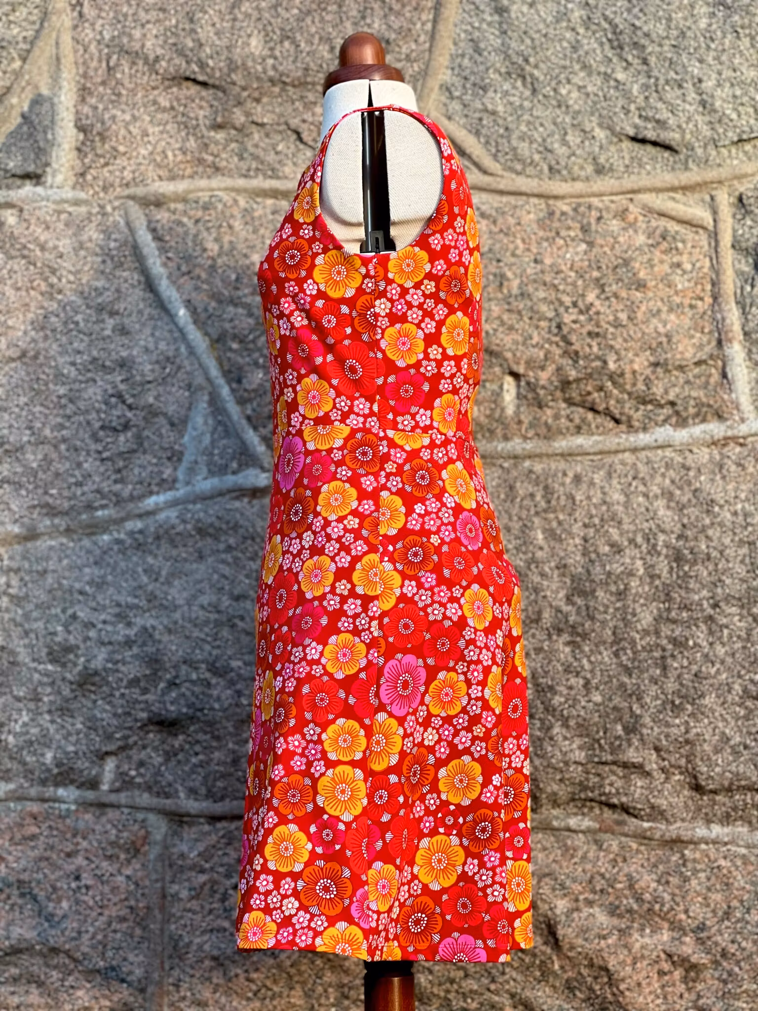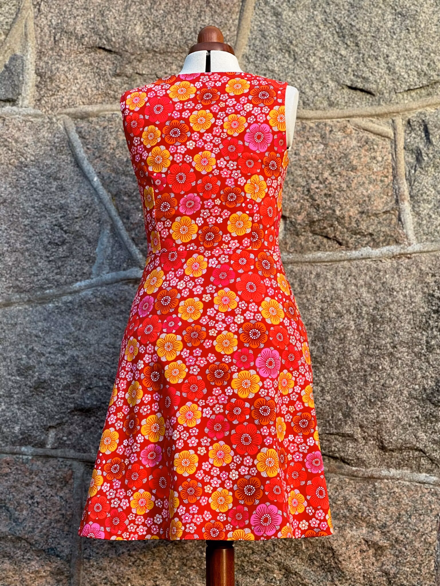 Känning i mer figurnära modell sydd i ett mjukt härligt jerseytyg. Klänningen har kantig halsringning, är avskuren i midjan och har insnitt fram och bak och sedan vidd i kjolen. Perfekt för ljuva sommardagar.