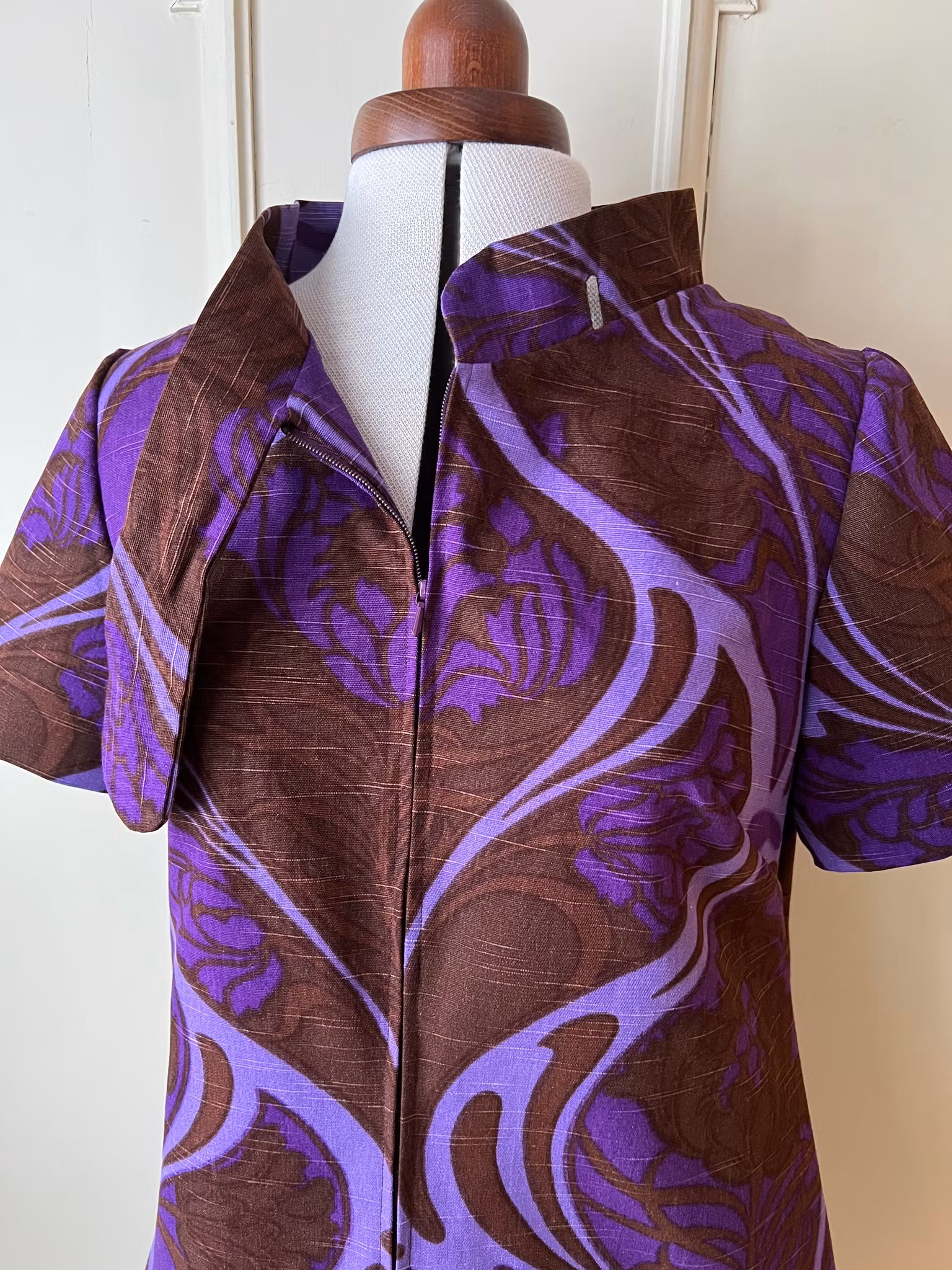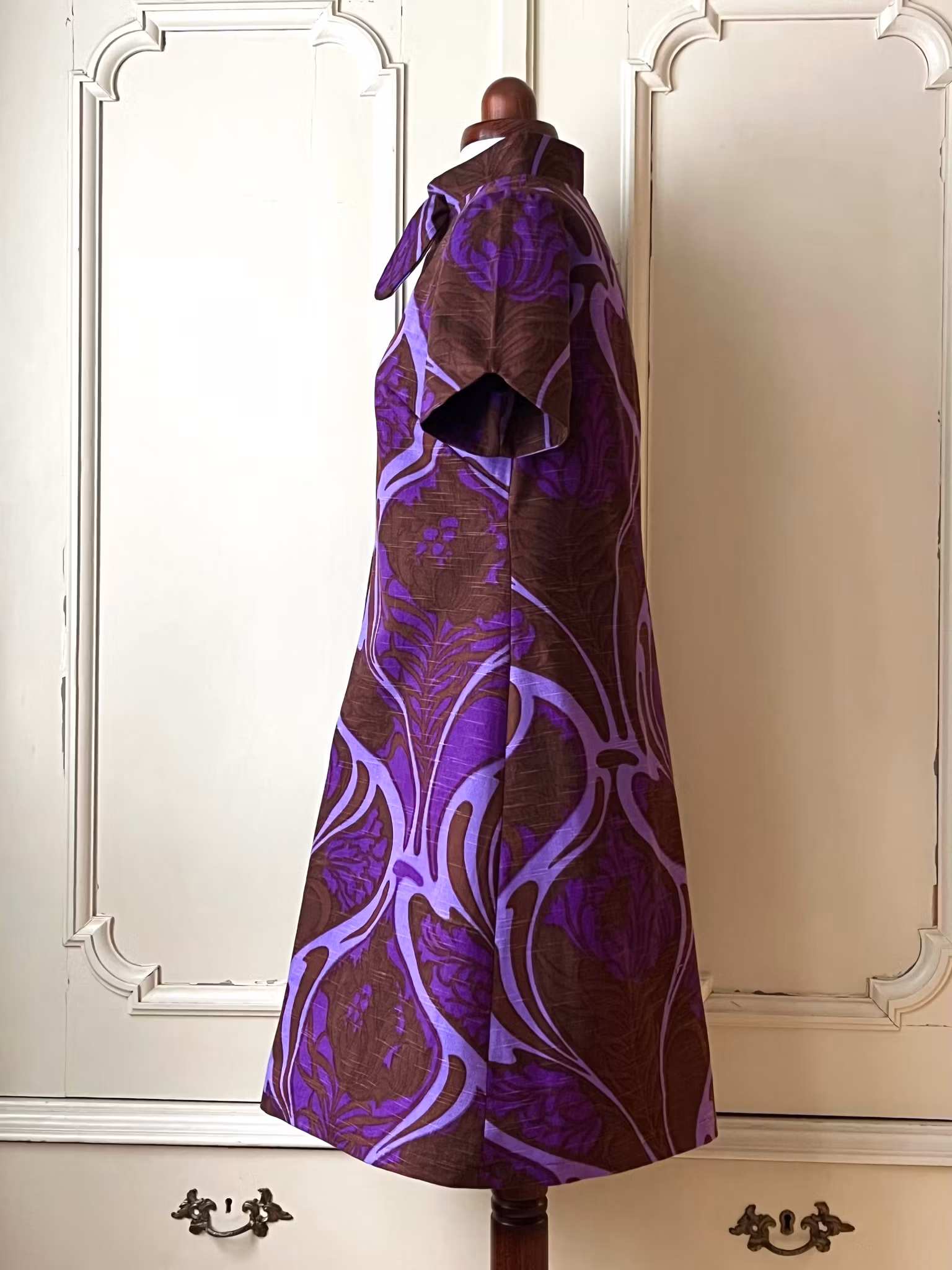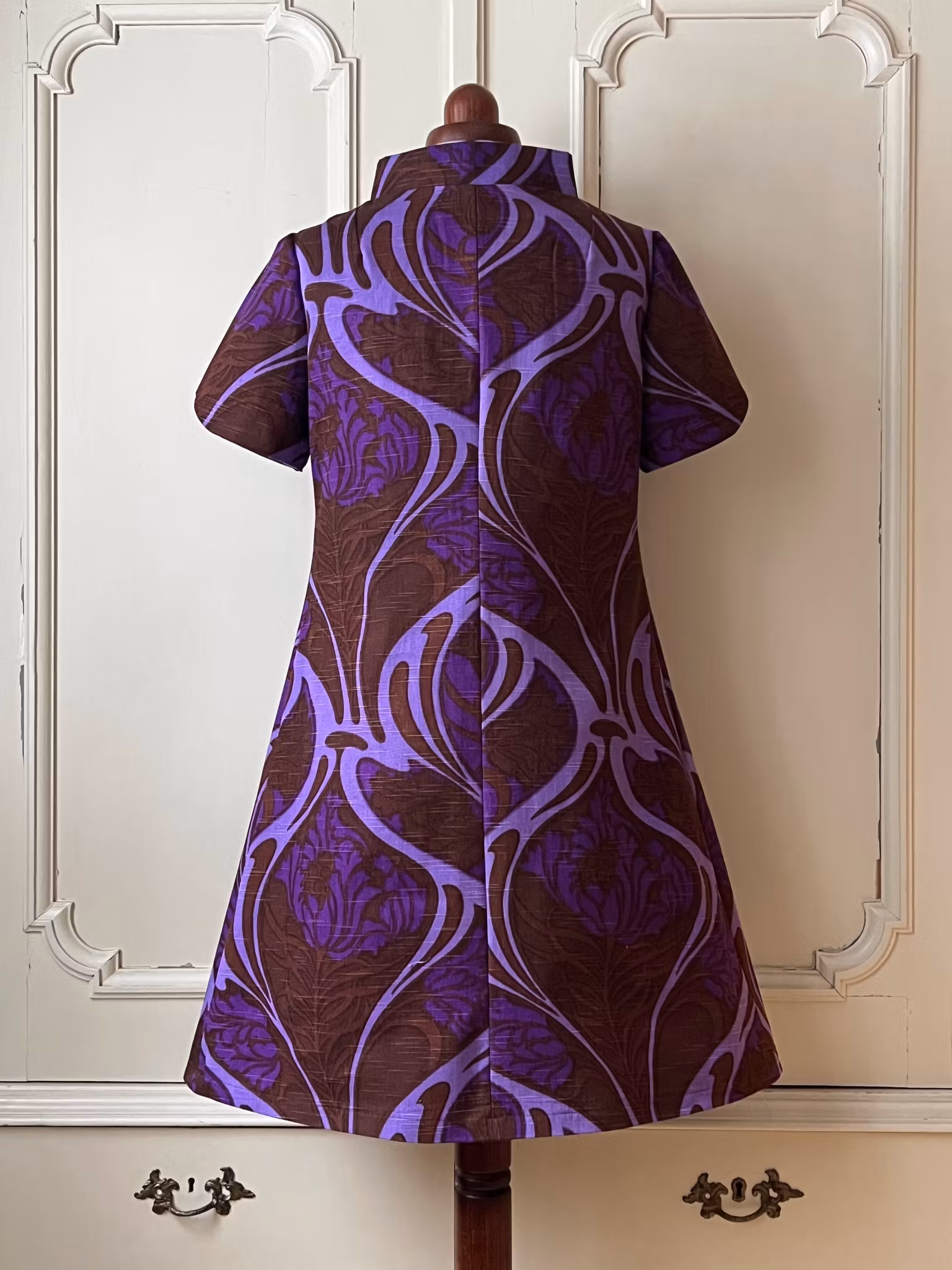 Klänning sydd i A-linjemodell i ett äkta retro/vintagetyg från 1960- eller 70-talet.