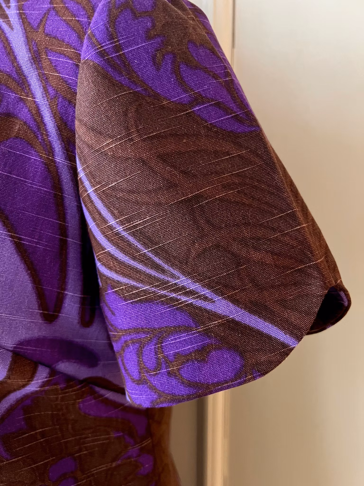 Material: vävd bomull, mellankraftigt med lite struktur - fin så kallad boråskvalitet. Mycket fint använt skick med välbevarade färger; brunt och lila.