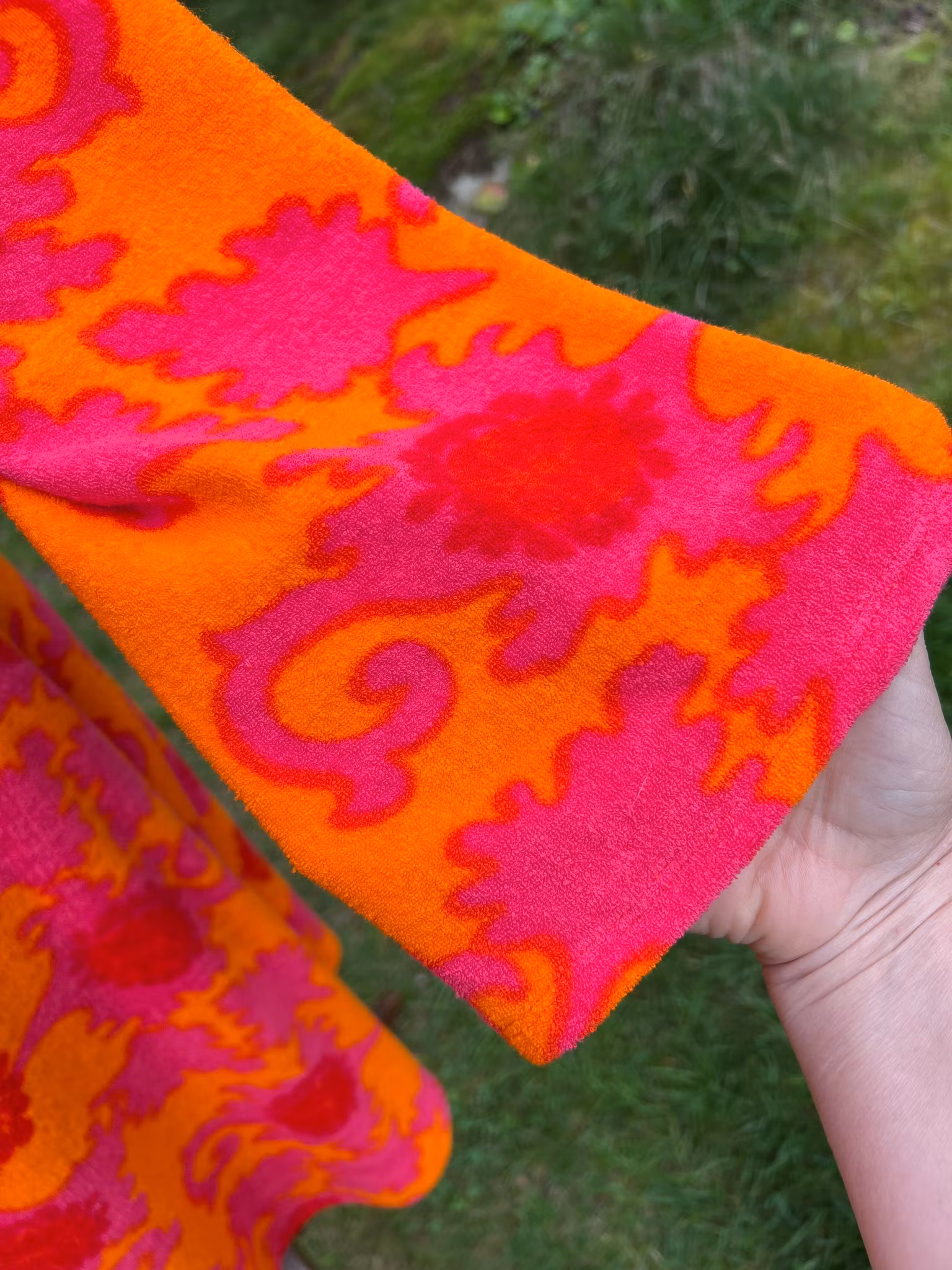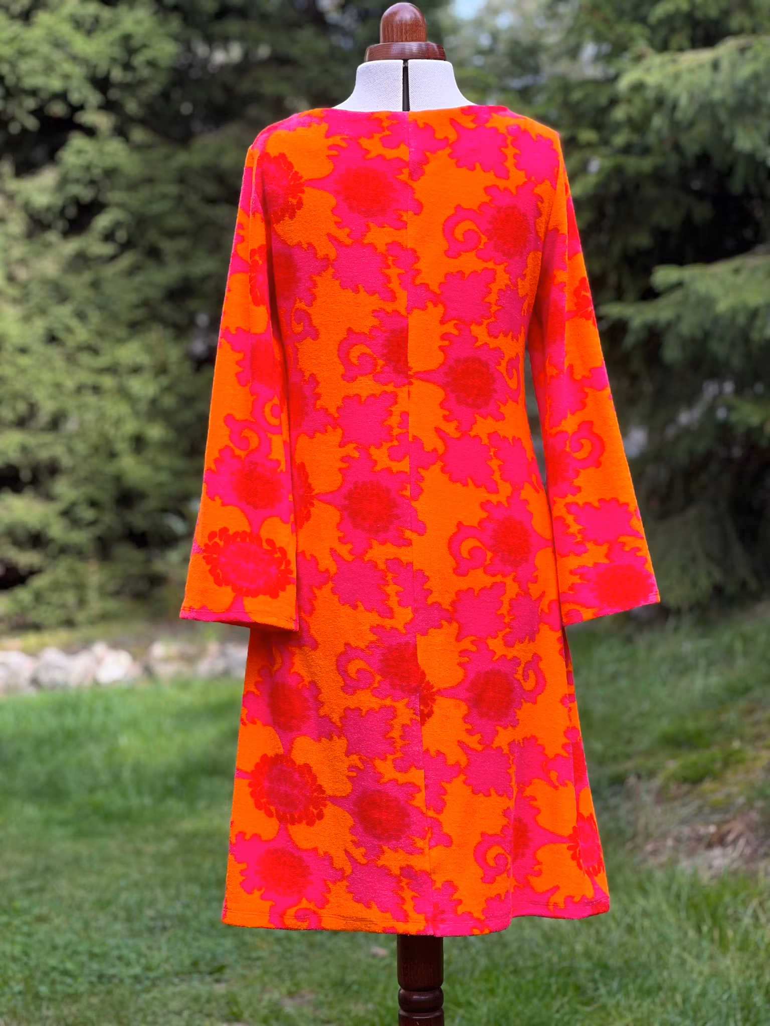 Klänning sydd i A-linjemodell i ett unikt, äkta retrotyg från 1960- eller 70-talet. Den har en lång ringdragkedja fram och hellång ärm, som är lite utställd nertill. Mjuk härlig bomullsfrotté med stretch i. Tyget är i oanvänt skick och färgerna formligen lyser.