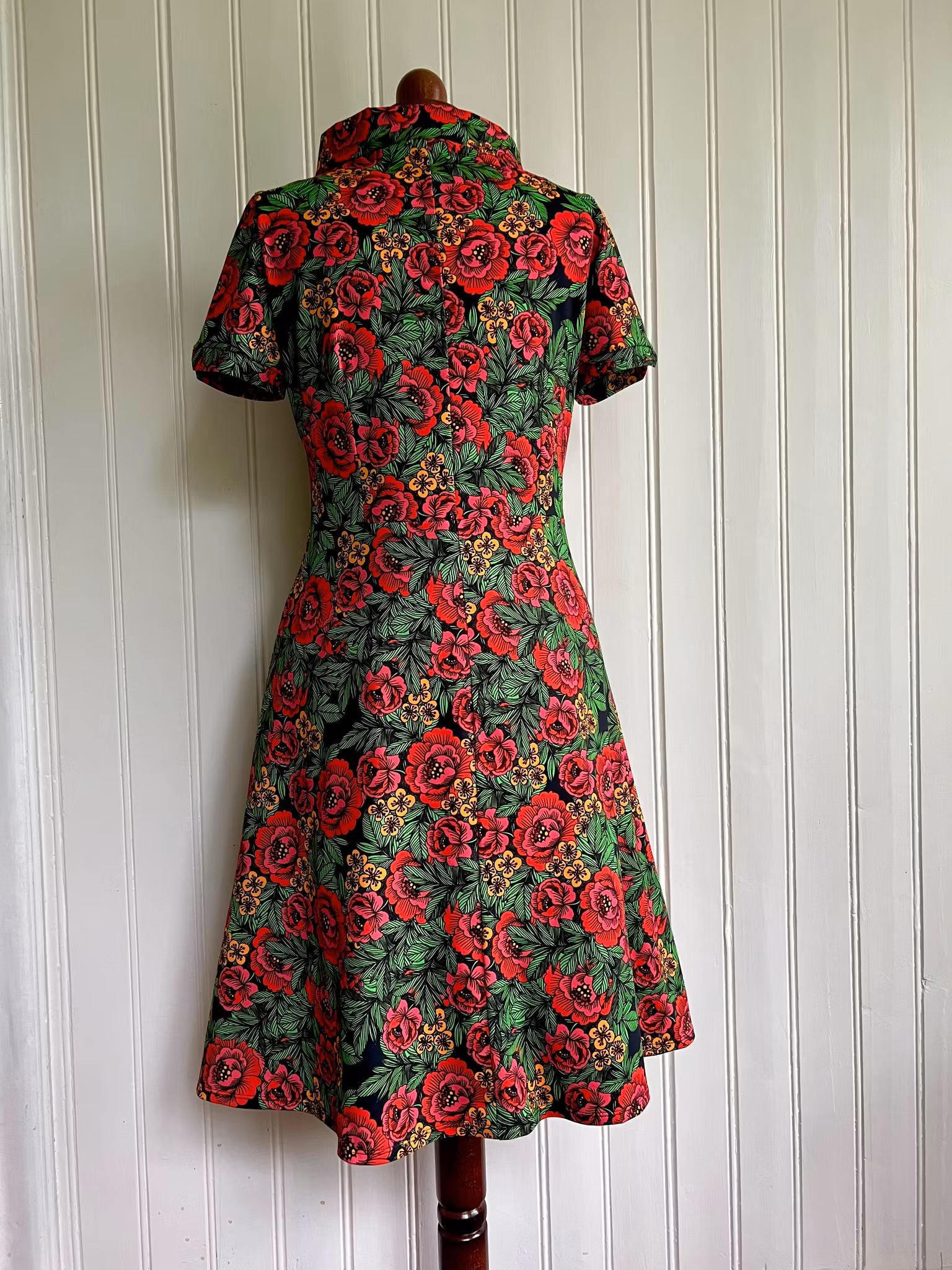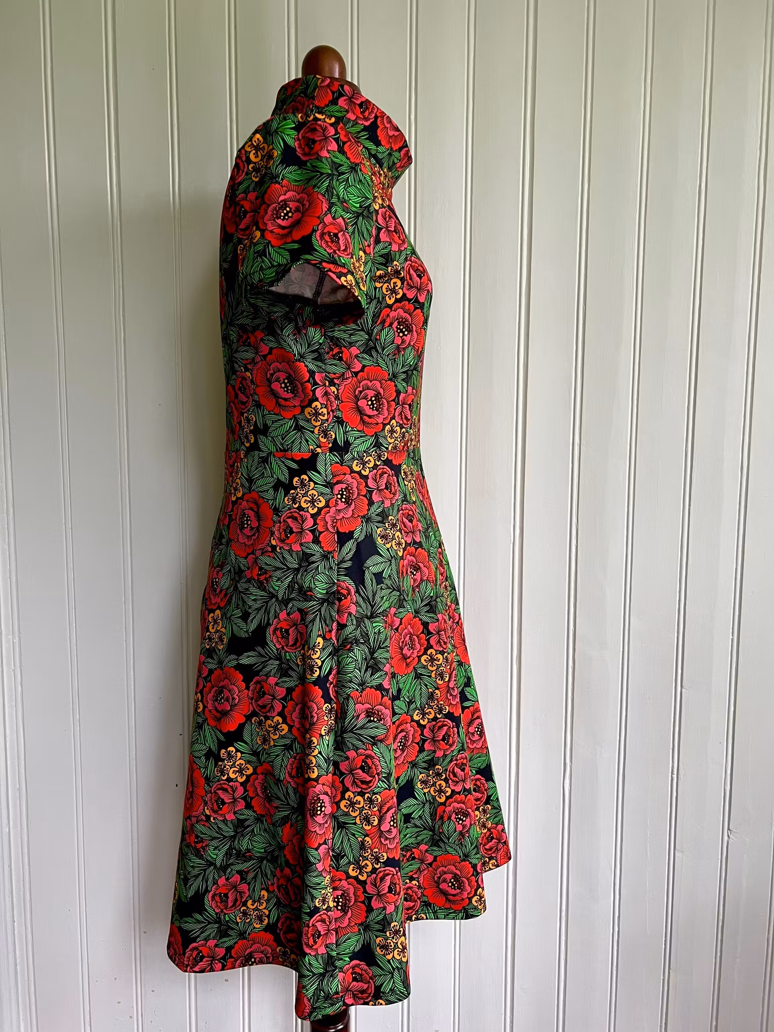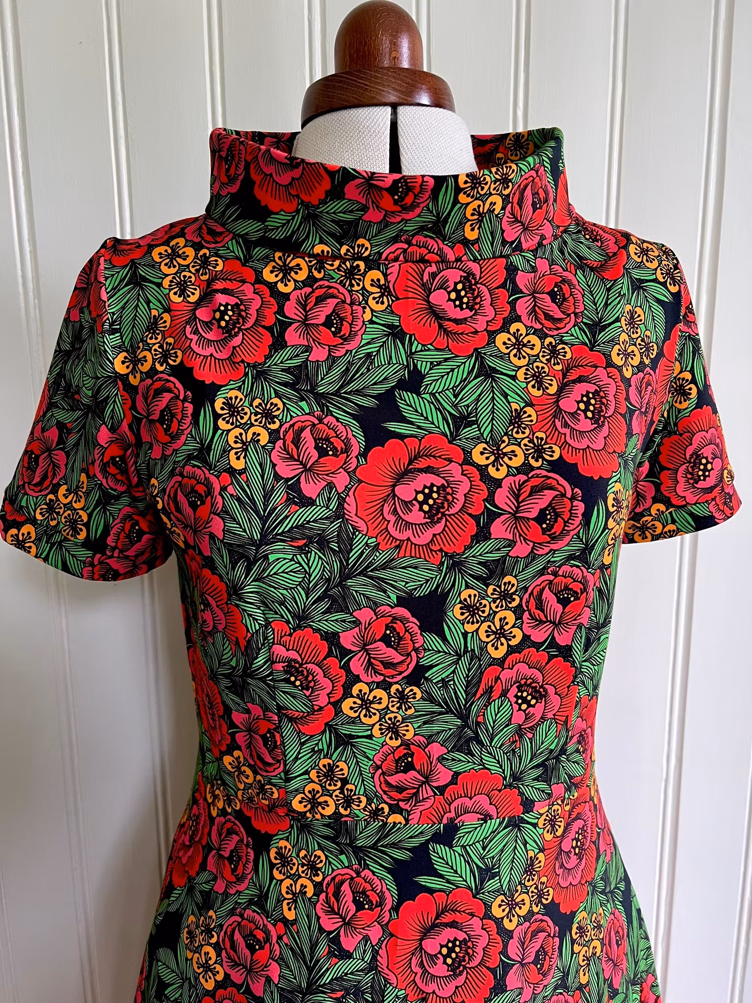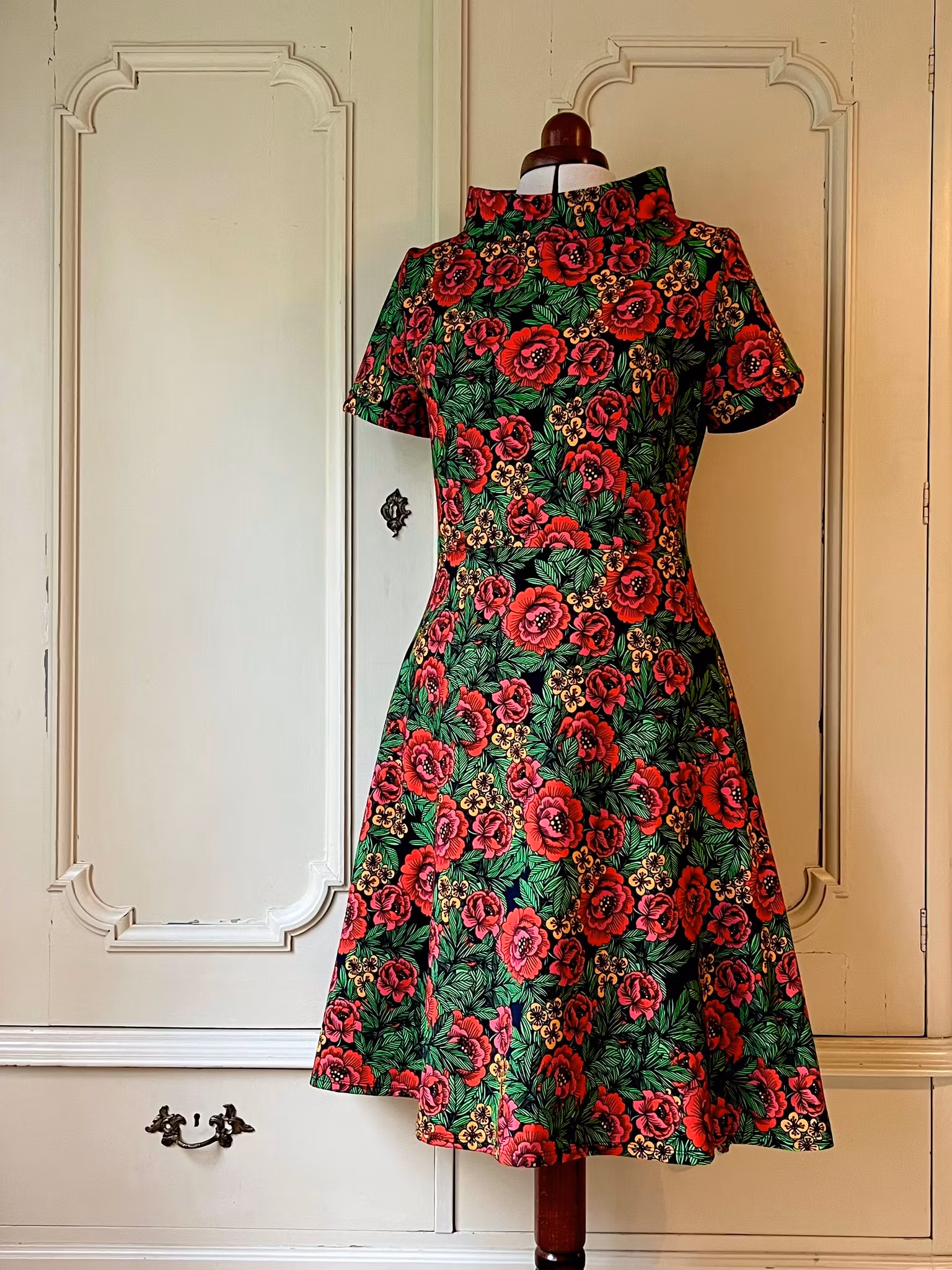 Klänning sydd i ett mjukt härligt jerseytyg. Den har en lite vidare krage som dubbelviks. För en mer figurnära form har den insnitt i midja och rygg samt är avskuren i midjan. Den har en kjol med mycket vidd i. Delat avslut på ärmen som en fin detalj.