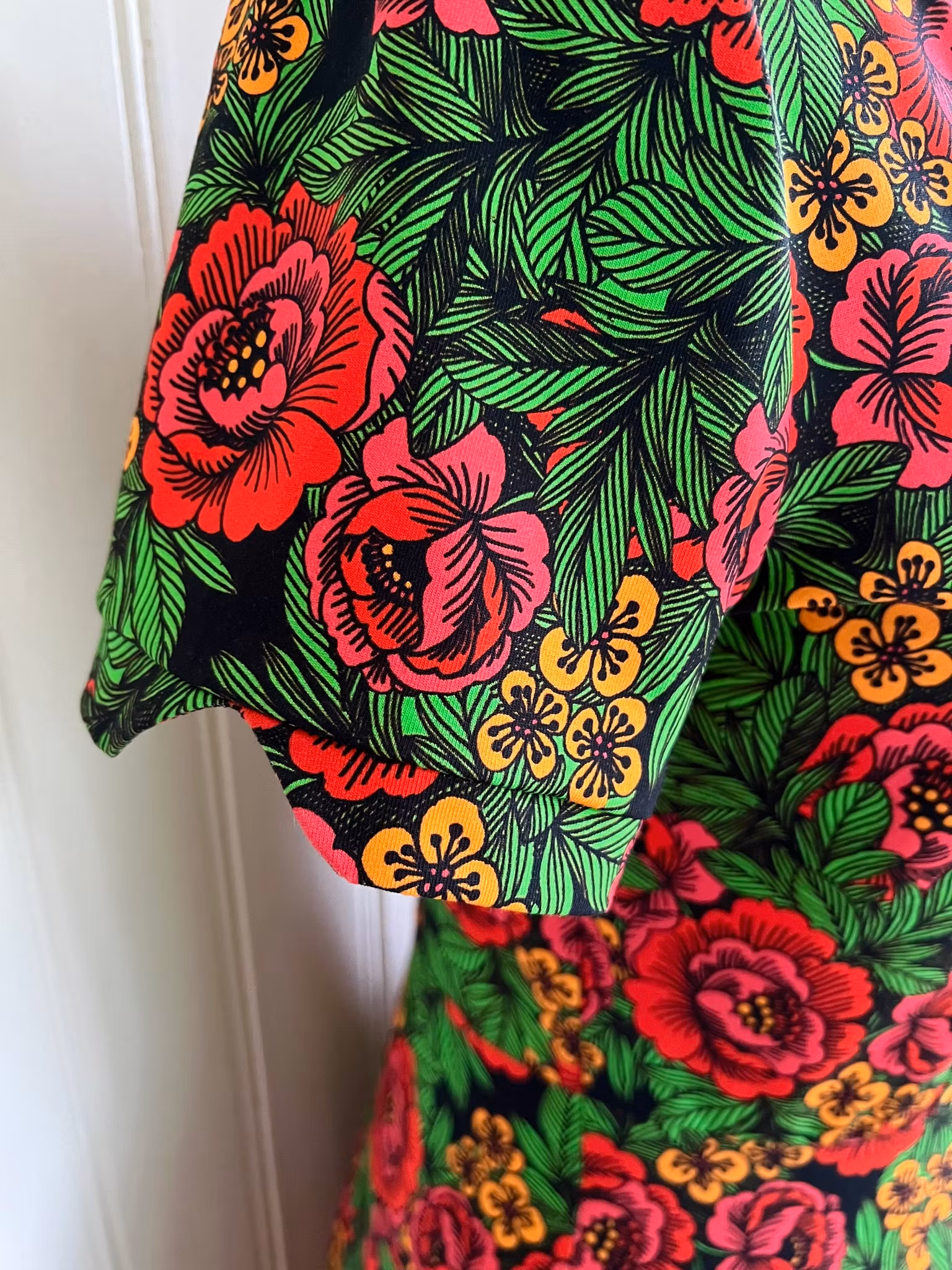 Tyget är designat av Leena Renko för Vintage in my heart. Material: 95 % bomull, 5 % elastan, med gott om stretch i. Krympmån 4 %. Tvättas i 40 grader och torktumlas ej.