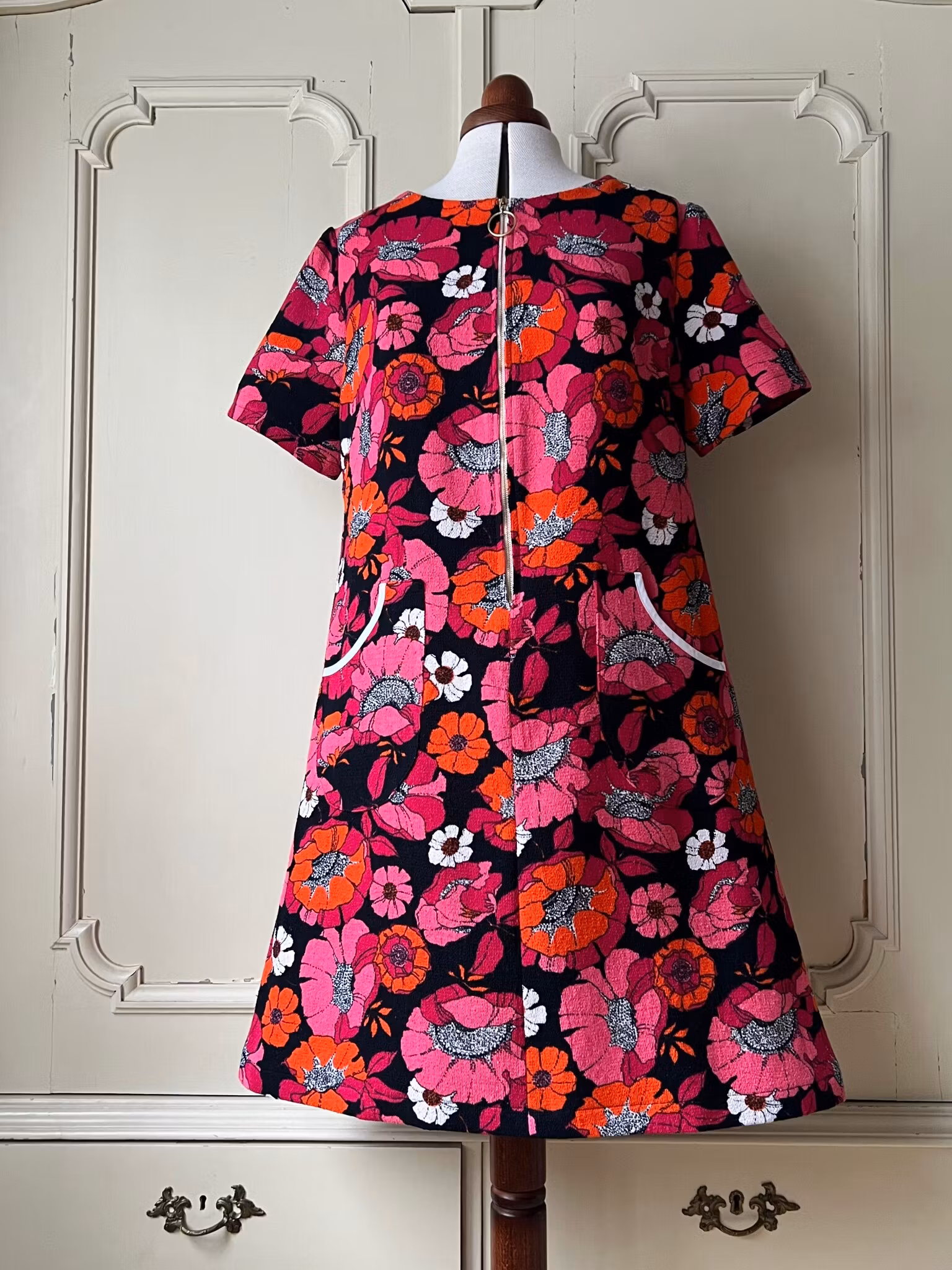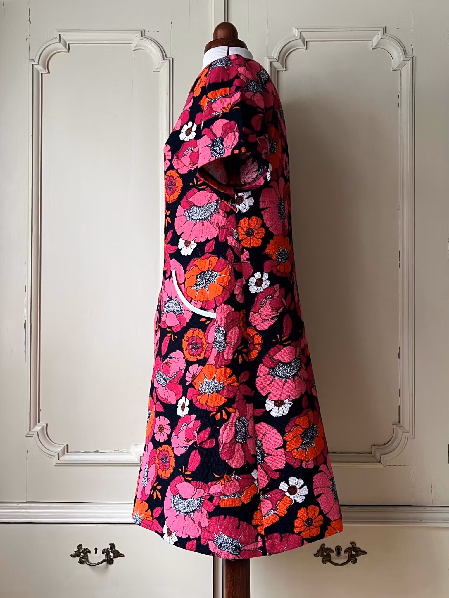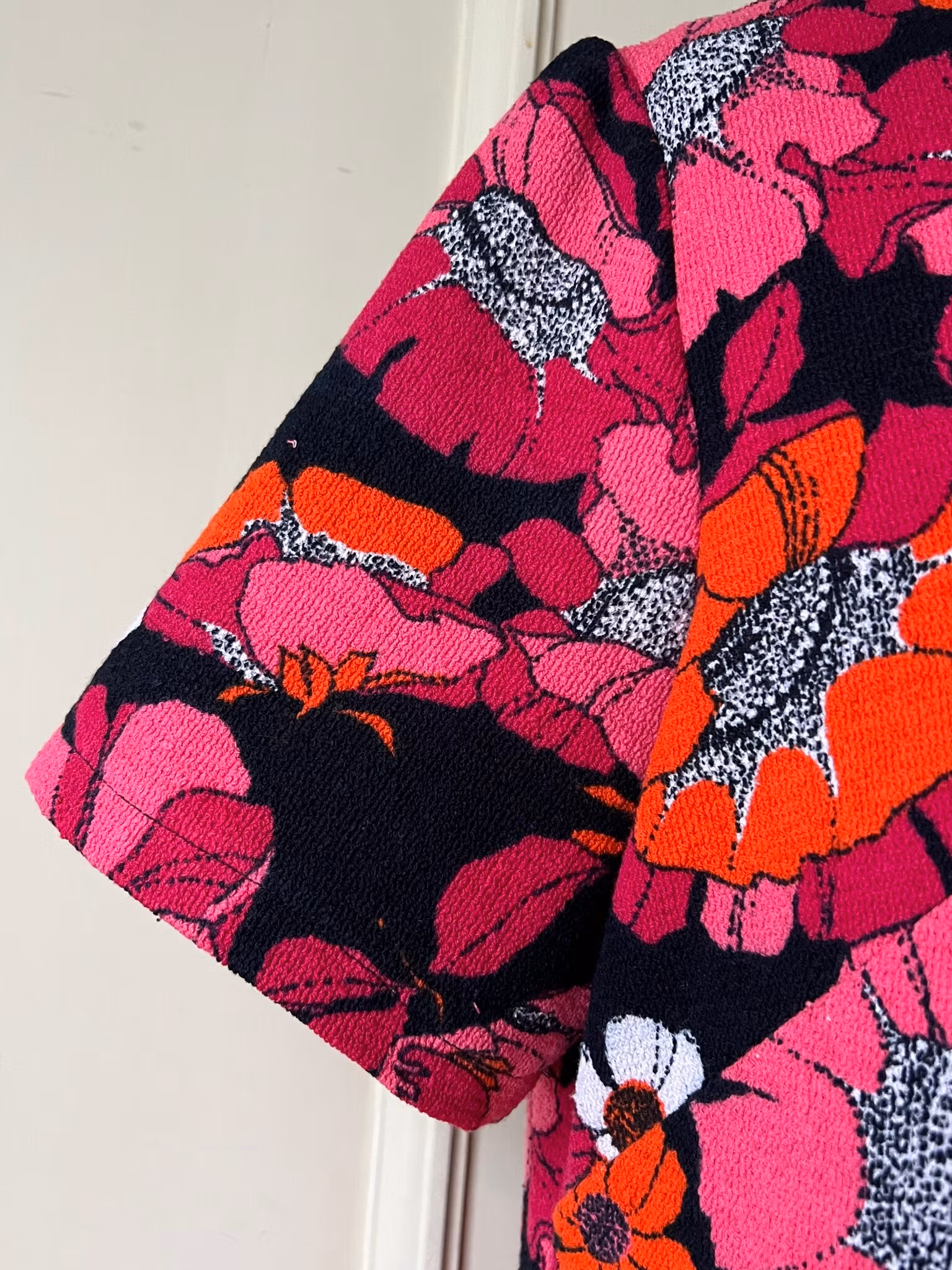 Klänning i A-linjemodell sydd i ett äkta retro/vintagetyg i frotté, troligtvis 1960-tal.